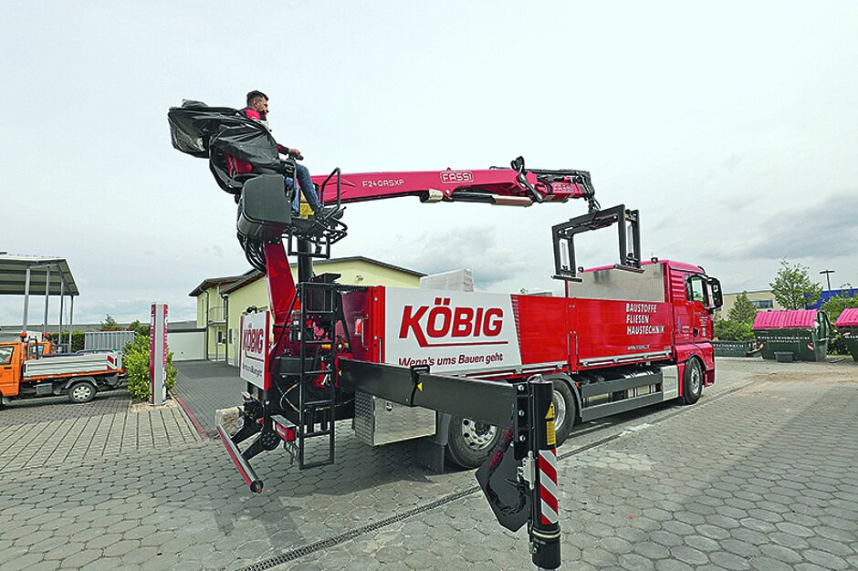 Während es beim Entladen von Vorteil sei, so Buljevic, vom Steuerstand aus auch die Ladefläche im Blick zu haben, mache sich bei der kontinuierlichen Zunahme von Hochkranleistungen die zusätzlich bestellte V7-Fernsteuerung bezahlt. Immerhin liegt die maximale Ausladung des F240AS bei 13,55 m, da könne er sich mit der Funkfernsteuerung jederzeit so positionieren, dass er die Ladung optimal im Blick hat.