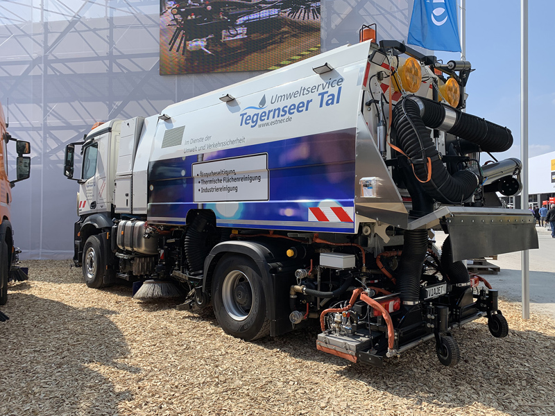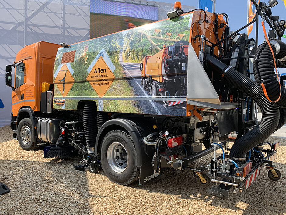 Das zweite Exponat von FAUN ist ebenfalls eine 7 m³Aufbaukehrmaschine auf einem 1843L Arocs-Fahrgestell von Mercedes Benz mit 4.500 mm Radstand. Diese Maschine fährt komfortabel mit einem PowerShift Getriebe in Kombination mit dem Fahrhydrostat HS2000. Besonderheit dieser Maschine, sie kann als Kehrfahrzeug und als thermischer Flächenreiniger genutzt werden. Im Fall einer Havarie müssen somit nicht mehr zwei Fahrzeuge ausrücken, sondern effizient und kostensparend fährt nur die VIAJET AQUATHERM zum Einsatzort. Auf die verschmutzte Fläche, z.B. Ölverunreinigungen, wird warmes Wasser aus dem großen 4.200 l Frischwasservorrat und ein Tensidkonzentrat aufgetragen, gereinigt und über die gesamte Fahrzeugbreite vollständig abgesaugt.