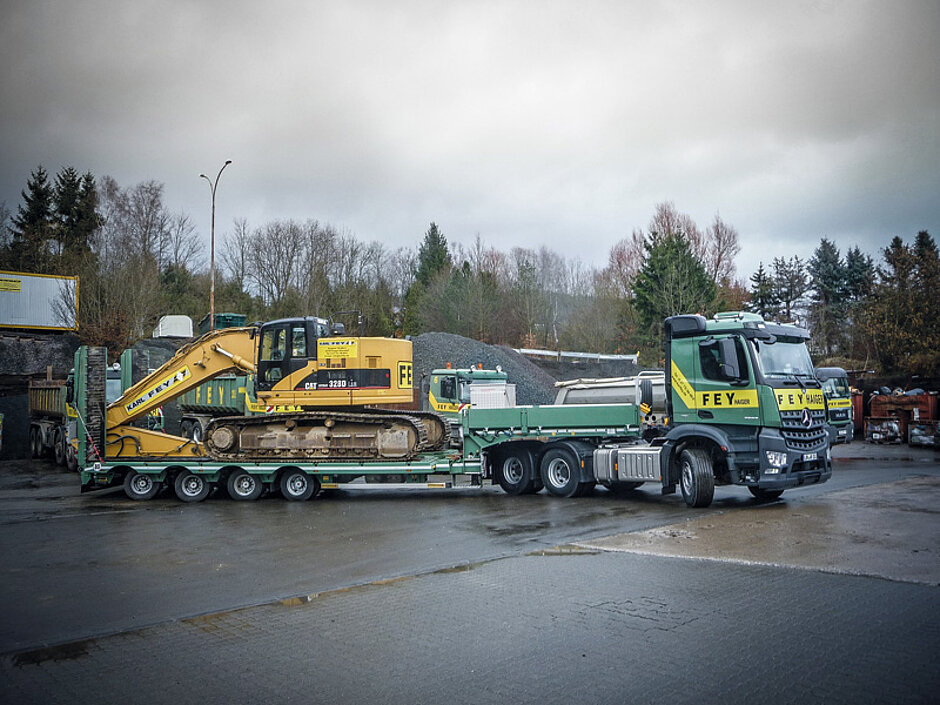 Wo die Fahrer bisher noch Hand anlegen mussten, übernimmt ein Steuerungssystem den Kraftakt: Statt jede Verbreiterungskonsole einzeln ausziehen und nachfolgend die Bohlen einlegen zu müssen, betätigt der Fahrer hier den Rechts-Links-Auszug und schon kann der Ladevorgang starten. Die Verbreiterung lässt sich stufenlos ausfahren und passgenau der Maschinenbreite des Ladevolumens angleichen. »Und durch die ausziehbare Ladefläche können die erlaubten Achslasten durch Verschieben des Lastmittelpunktes immer erreicht werden«, betont Wolfgang Fey. In seinem Bauunternehmen in Haiger-Allendorf im Lahn-Dill-Kreis wird der flexible 4-Achs-Semi sowohl Baumaschinen (Raupen, Bagger, Walzen) als auch Baustelleneinrichtungen (Container, Bauwagen, Verbauplatten) bewegen. Als Clou gelten die herausnehmbaren Zwischentische, wodurch sich Radmulden zum Transport von Radladern bilden lassen.