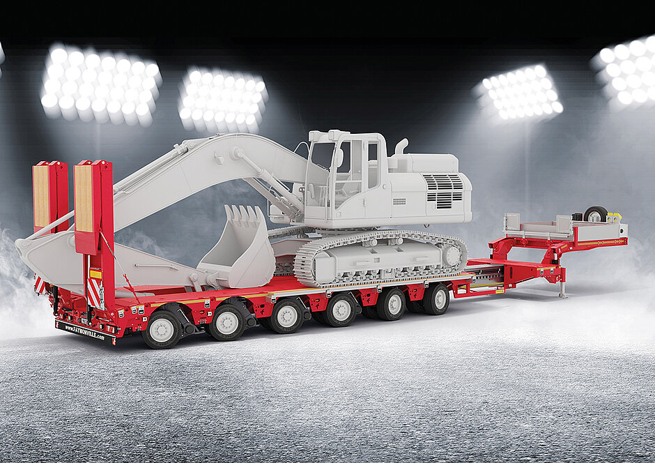 Entdecken Sie den 6-Achs MultiMAX PA-X Semi-Tieflader: Teleskopierbar, mit Rampen, Pendelachsen und Löffelstielmulde