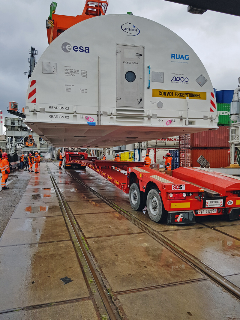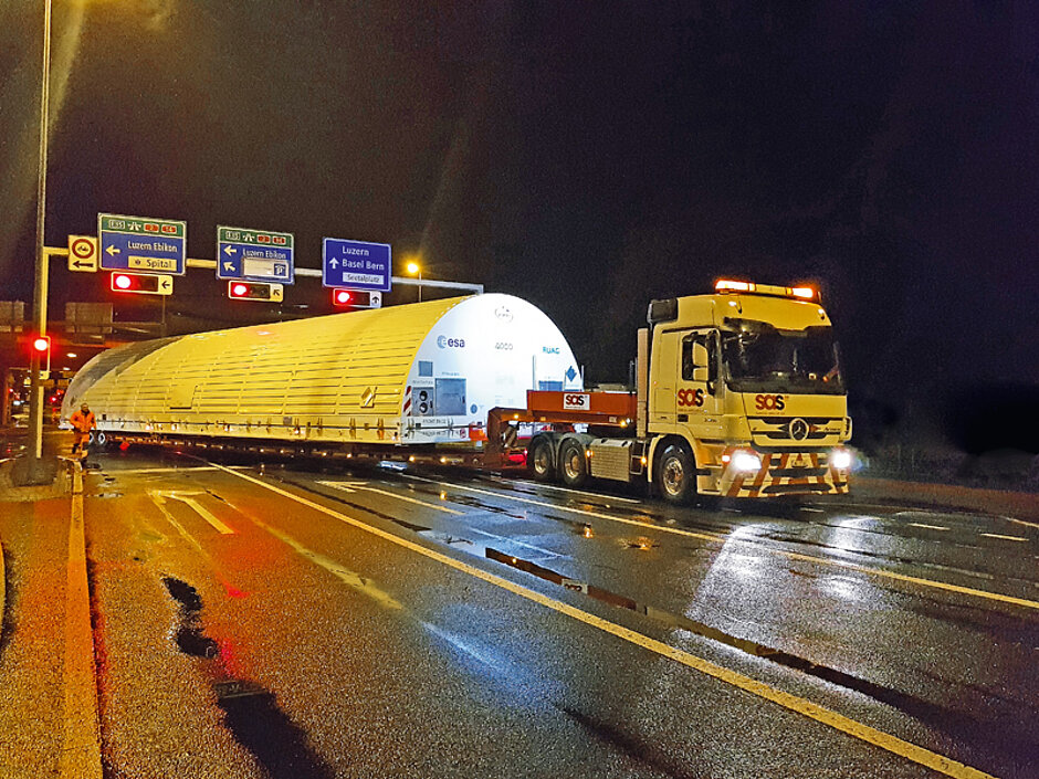 Vom Binnenschiff im schweizerischen Muttenz bei Basel wird ein halbrunder Container auf das Tiefbett verladen, rund 100 km lang ist die anstehende Strecke zum Abladepunkt in Emmen nahe Luzern. »Die Gesamtzuglänge von 32 m ist für die Aus- und Einfahrten der Autobahnen recht heikel«, erklärt Amsler-Mitarbeiterin Jeannette Schmidmeister die ersten Brennpunkte, die das Fahrer-Team zu überwinden hat. »Die Leitplankenhöhe von bis zu 130 cm beidseitig fordert uns heraus. Und bei den vielen Kreiseln ist die Ein- und Ausfahrt ein schwieriger Moment. Auch deren Durchmesser gilt es zu beachten wegen der Kurvenfahrt mit diesen langen Achsabständen.«