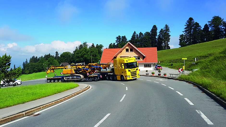Die festgelegte Route war mit einem solchen Gerät noch nie befahren worden. Wegen einer Brückenbaustelle an der Entladestelle war die übliche Strecke gesperrt«, erklärt Fabian Hämmerle, der somit in der Planung umdisponieren musste. »Der Umweg über das ›Bödele‹ war eine besondere Herausforderung. Sehr enge Kurvenradien und erhebliche Steigungen warteten auf uns. Und wir waren ja schließlich mit ca. 100 t Gesamtzuggewicht unterwegs.«