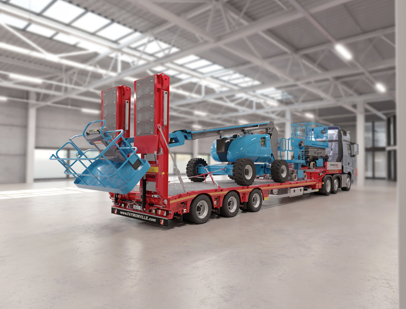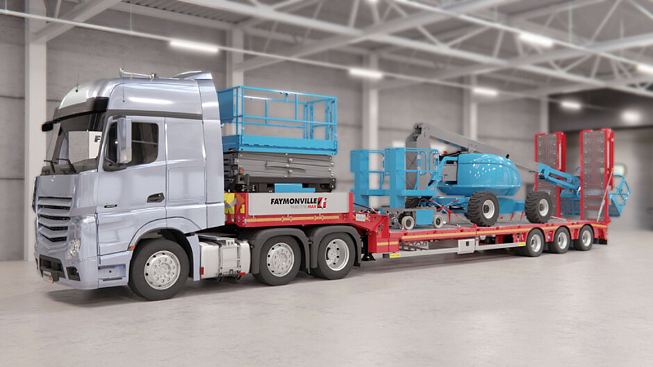 Flache Auffahrwinkel im Bereich der Rampen und des Schwanenhalses sowie eine optimierte Heckanschrägung sorgen für einen reibungslosen Ladevorgang von Maschinen mit wenig Bodenfreiheit. Zur Optimierung der Lastverteilung ist die Ladefläche mit 3 000 mm Auszug erhältlich. 44 Verzurrringe und 28 Verzurrpunkte in der Ladefläche und bis zu 30 Verzurrpunkte auf dem Schwanenhals dienen bestmöglicher Ladungssicherheit. Der dreiachsige MultiMax Plus ist von Faymonville in zwangsgelenkter und nachlaufgelenkter Ausführung verfügbar. Das Fahrzeug weist trotz vollflächigem Gitterrostbelag eine niedrige Ladehöhe auf, was bei hohen Maschinen von Vorteil ist.