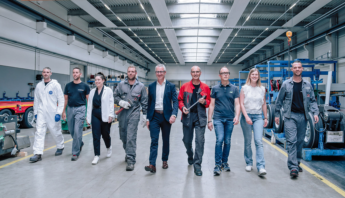 Tatsächlich fußt die Geschichte der Unternehmensgruppe auf alter Schmiedekunst, was viele Jahre später, in den 1960er-Jahren, dann im Fahrzeugbau mündete. Von da an entwickelte Faymonville seine ersten Kipperfahrzeuge und ebnete den Weg zu unterschiedlichsten Transportlösungen. Und wie es zu einer klassischen Unternehmergeschichte dazugehört, hat es dabei Höhen und Tiefen gegeben. Einher ging die Faymonville-Geschichte allerdings immer mit großer Investitionsbereitschaft: Neben weiteren Produktionsstätten setzte das Unternehmen beispielsweise auf die hauseigene Entwicklungsarbeit sowie die Erweiterung seines Portfolios. Zu den jüngsten Errungenschaften zählen zweifelsohne die Entwicklung des neuen modularen Konzepts »Max Trailer«, die Übernahme des italienischen SPMT-Spezialisten Cometto sowie die Gründung der Online-Plattform »SpecialTrailers 24«. Insgesamt konnte Faymonville seinen Umsatz von 1 Mio. Euro im Jahr 1985 auf satte 442 Mio. Euro im Jahr 2023 kontinuierlich steigern und hatte insbesondere in branchenschwachen Jahren bewiesen, dass sich Kontinuität auszahlt. Heute beschäftigt die Faymonville-Gruppe über 1 400 Mitarbeiter und hat allein von 2017 bis 2023 mehr als 120 Mio. Euro in Technologie und Infrastruktur investiert.