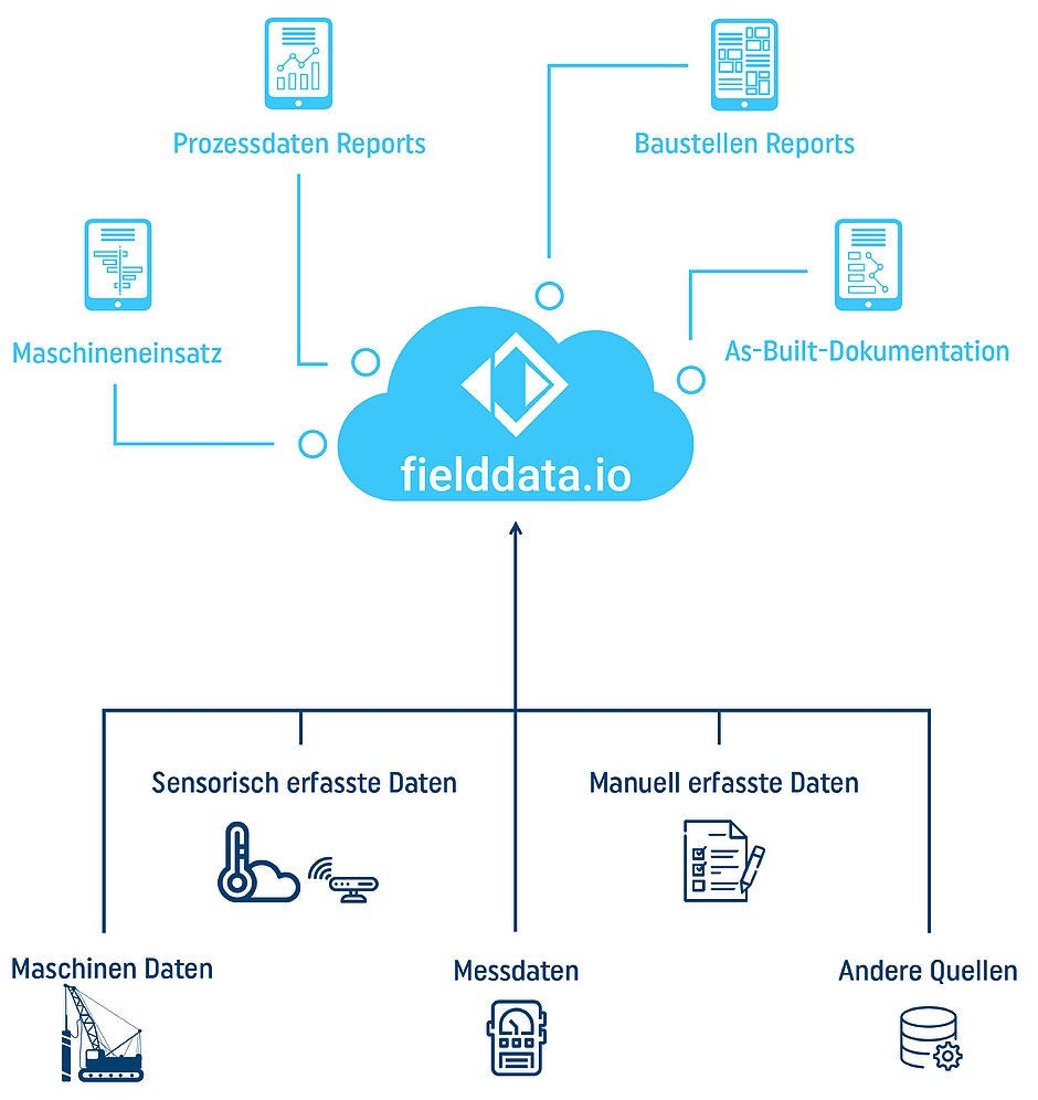 Der wohl wichtigste Schritt bei der Digitalisierung von Bauprojekten im Spezialtiefbau ist der Einsatz einer geeigneten Construction Data Management Plattform (CDMP). Ziel des Einsatzes ist es, alle relevante Projektdaten zu sammeln, zu normalisieren und zu analysieren um entsprechende Berichte für den täglichen Gebrauch zu generieren. Die Plattform dient als zentraler Ort für die Speicherung, Verknüpfung und Auswertung aller sensorisch erfasster Daten der Spezialtiefbau-Maschinen. Eine solche Plattform für die Dateiablage bietet die fielddata.io GmbH an, sowie integrierbare Lösungen für die Erstellung automatisierter Produktionsdatenreports und aufschlussreichen Verbrauchsdatenanalysen sowie nützlicher Statusberichte zu Baustellen- und Maschineneffizienz.