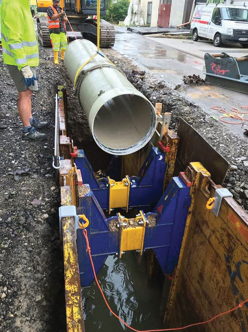 - Rohrleitungssysteme mittels Verlegehilfen im Graben gesichert und in hängender Form exakt positioniert werden. Die Grabenbreite wird oft deutlich geringer gegenüber der herkömmlichen Bauweise. Auch Untergrundverbesserungen bei schlecht tragfähigen Böden werden in der bekannten Form überflüssig.