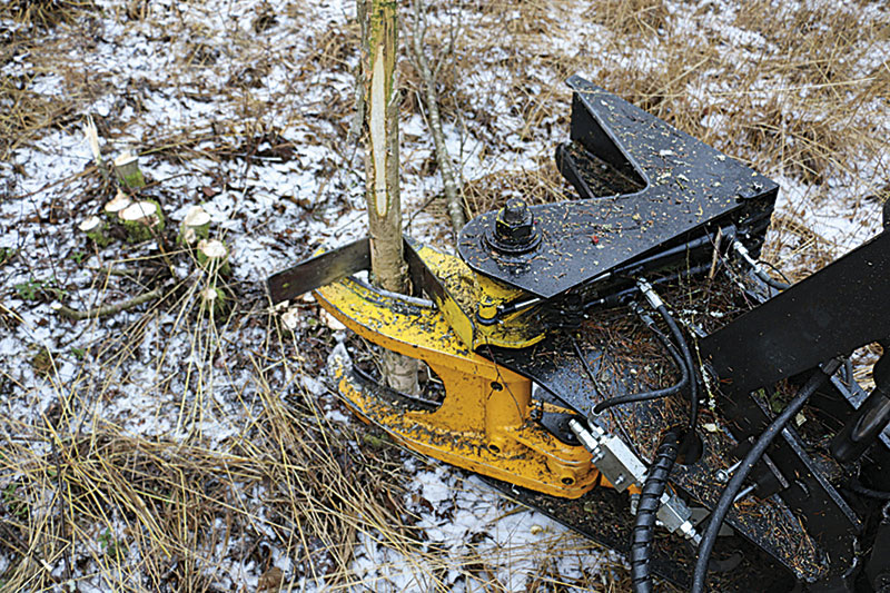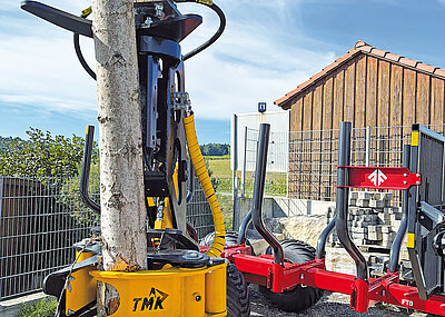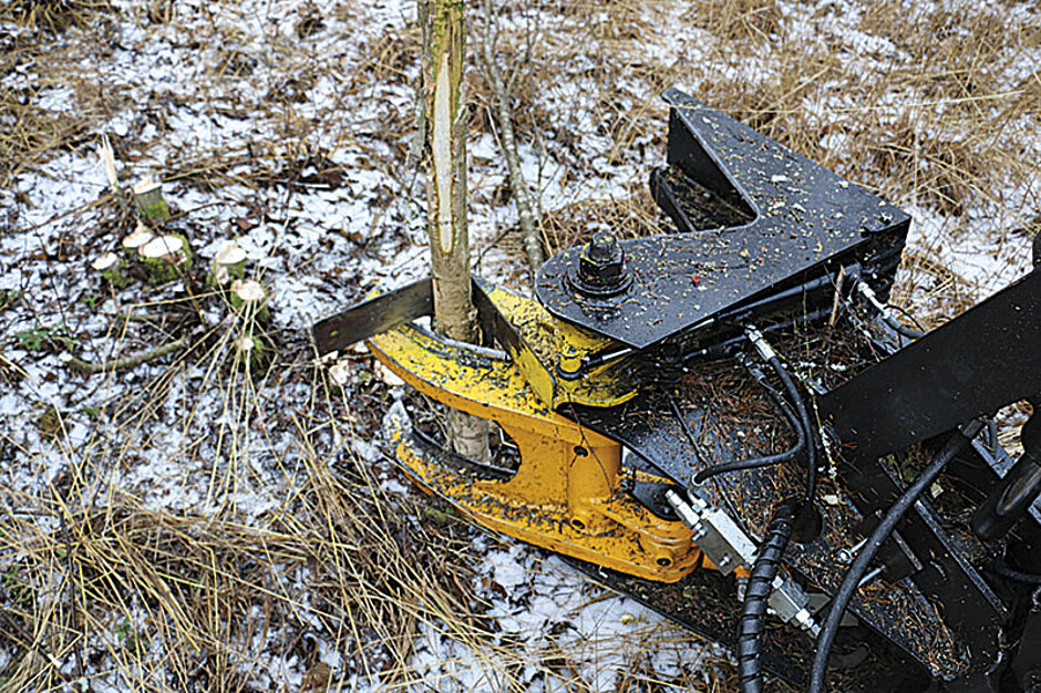 Die TMK-Baumschere kann auch mit einem automatischen und produktivitätssteigernden Sammler ausgestattet werden. Dabei schließt sich der Sammelarm zeitgleich mit der Öffnung des Greifarms. Das Ablegen der gesammelten Bäume ermöglicht dann ein zusätzliches elektrisches Ventil in der Schere.