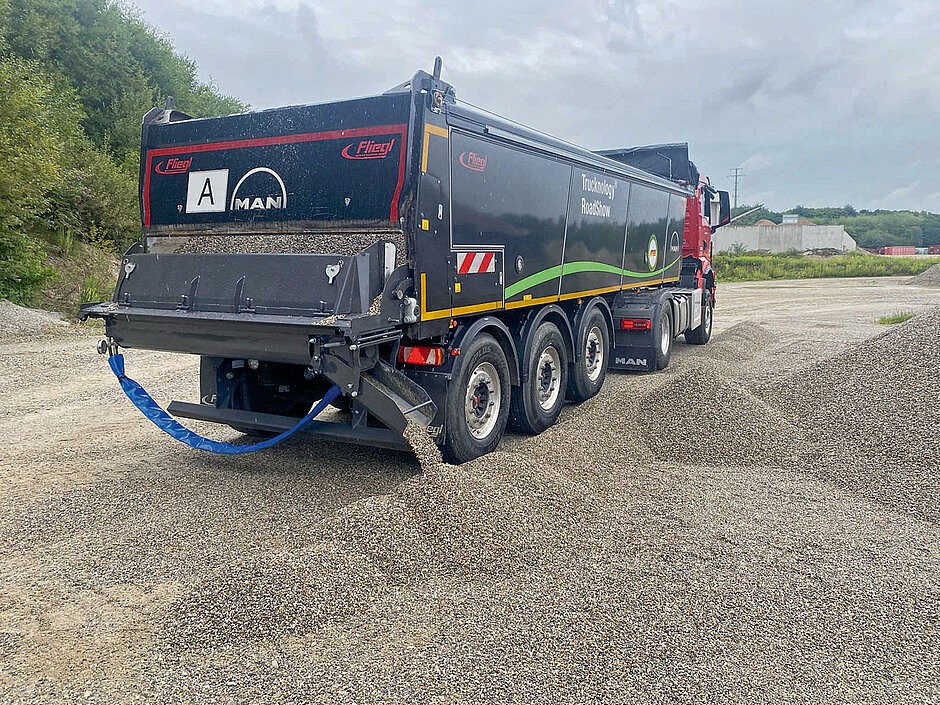 Nach der Erstmontage ist die Anbauschnecke schnell und einfach montier- oder demontierbar. Die intuitive Bedienung und das modulare System machen den Einsatz im Tagesgeschäft nach Einschätzung von Fliegl besonders einfach – ohne lange Rüstzeiten oder Schulungsaufwand. Die geschlossene und seitlich geführte Entladung sorgt für saubere Baustellenverhältnisse, auch bei empfindlichen Nebenflächen. Der gezielte Einbau von Asphalt, Schotter oder Bankettmaterial reduziert Streuverluste – kein Verunreinigen angrenzender Flächen, kein unnötiger Nachbesserungsaufwand.