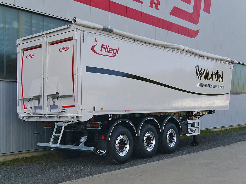 Für das geringe Leergewicht sorgen unter anderem das Stahl-Chassis in Leichtbauweise, der patentierte Curved-Frontabschluss und die Alufelgen. Natürlich ist auch die Aluminium-Mulde so leicht wie möglich gebaut, die 2,15 m hohen Seitenwände bestehen aus 30 mm starken Hohlkammerprofilen. Mit dem Revolution, so das Unternehmen, zeige Fliegl, dass sich Leichtbau und Langlebigkeit nicht ausschließen: Der 6 mm starke Aluminiumboden der Mulde ist besonders leicht, mit einer Härte von 110 Brinell ist die Oberfläche aber besonders hart. Das sorgt für geringen Verschleiß auch bei abrasiven Gütern.