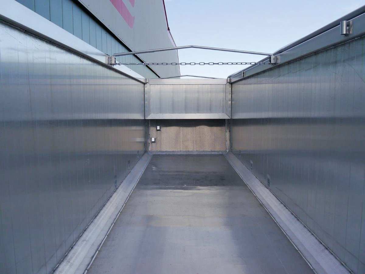 Im Boden eingelassen sind zwei zuschaltbare Rüttler, die mit Druckluft das Abladen etwa von Getreide beschleunigen. Die Membran-Rückwand besteht aus einer zweiflügeligen Tür, in jede der beiden Türen ist ein Kornschieber eingelassen, die rechte Tür bietet eine zusätzliche Sicherung der Verriegelung; auch die Klemmschrauben an der Mulde sind zusätzlich gesichert.
