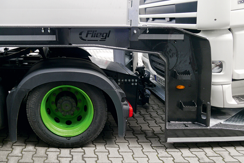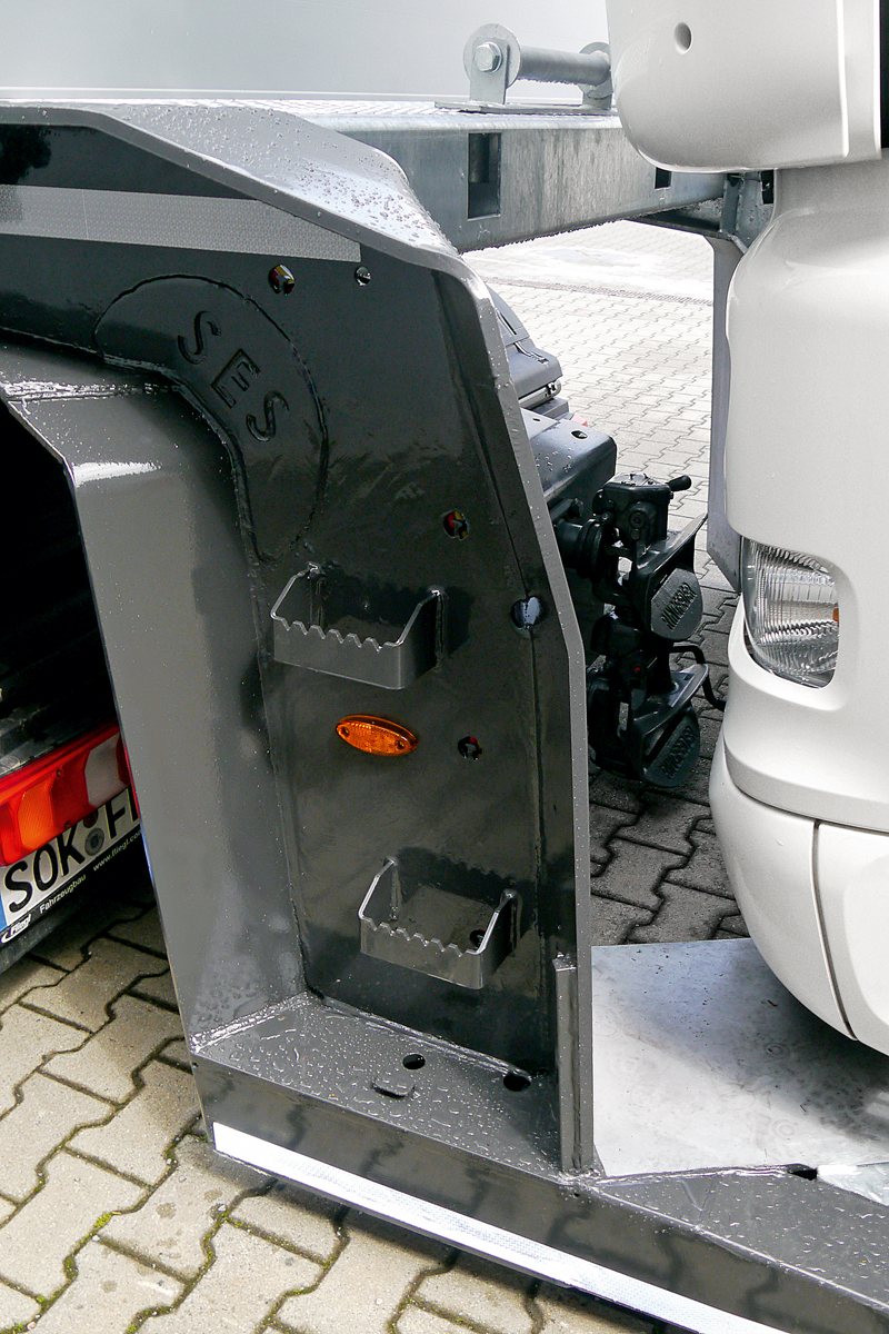Der weit ausgeschnittene Rahmenhals soll auch mit dreiachsigen Zugmaschinen bestes Fahren und uneingeschränktes Rangieren ermöglichen. Der integrierte rutschfeste Aufstieg optimiert das Handling und ermöglicht eine ungehinderte Erreichbarkeit von Seilwinde, Staukasten und Plattform. t