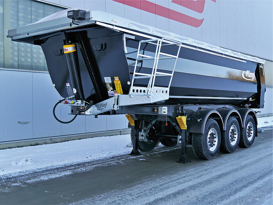 Die Seitenteile der nutzlastoptimierten 24,5-m³-Rundmulde bestehen aus 4 mm dickem hochverschleißfestem Stahl; der Boden ist im vorderen Bereich 4 mm stark, in der höher belasteten Abschüttzone sind es 5 mm. Dank konischer Form, die Mulde ist hinten 8 cm breiter als vorn, und der glatten Oberfläche ohne Anschläge im hinteren Bereich soll kein Ladegut hängen bleiben. Auch ohne zusätzliche Dichtung ist die gewölbte Membranklappe fast vollständig dicht, zwei Klemmschrauben mit Knebelverschlüssen erhöhen die Sicherheit zusätzlich. Das Doppelgelenkscharnier bietet einen großen Öffnungswinkel, das erleichtert das Abkippen.