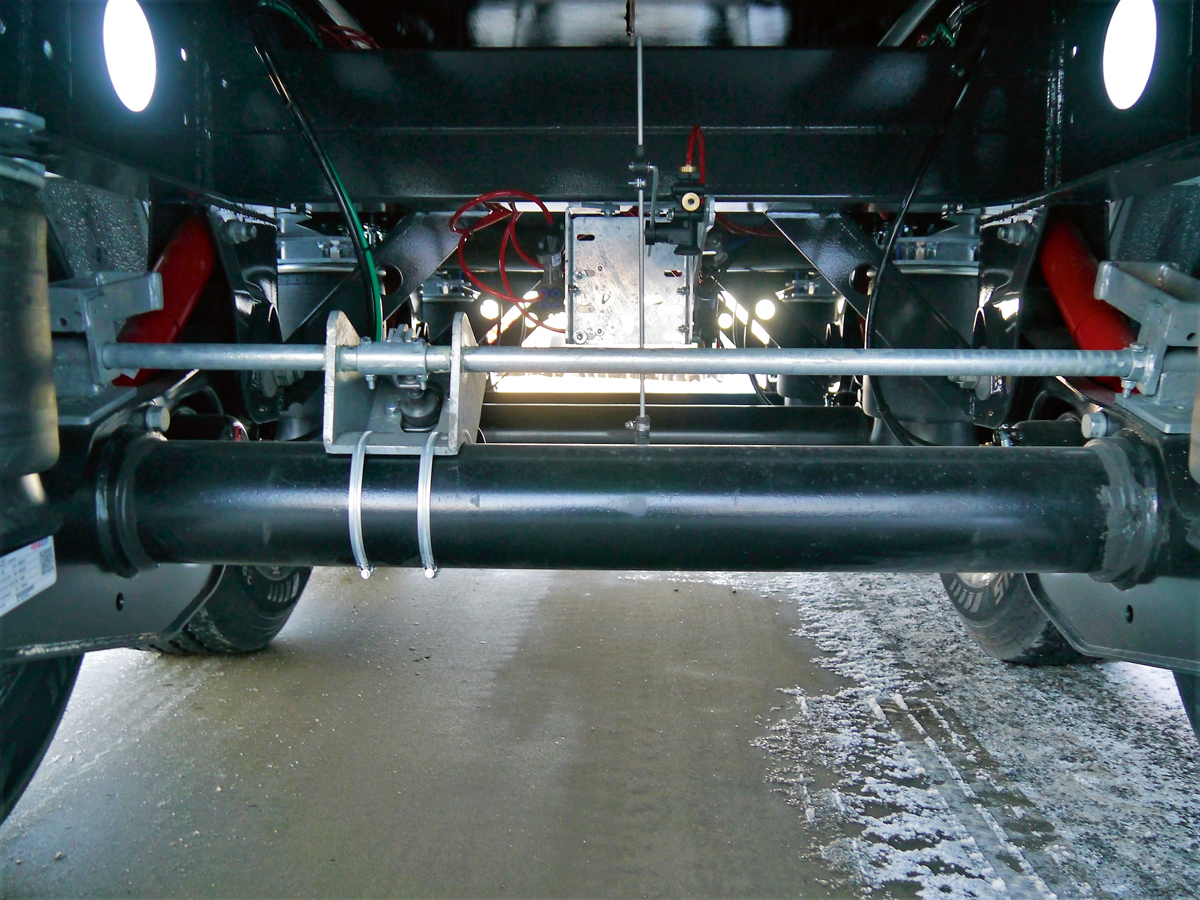 Die erste Achse kann auch unter Last angehoben werden, dadurch verlagern sich 6,7 t auf die Antriebsachse – mehr Traktion auf losem Untergrund ist die Folge. Ab einer Geschwindigkeit von 25 km/h senkt sich die Achse automatisch wieder ab. Da durch das Drive-on-System die Luftbälge nicht mehr vollständig komprimiert werden, halten die Gummiblöcke im Innern laut Fliegl deutlich länger. Gleiches gelte für die Arme der Luftfederaufnahmen, die an der tiefsten Stelle sitzen und dauerhaft Schmutz und Feuchtigkeit ausgesetzt sind. Als einziger Hersteller verzinkt Fliegl laut eigenen Angaben daher die Luftfederarme und bietet zehn Jahre »Anti-Rost-Garantie«.