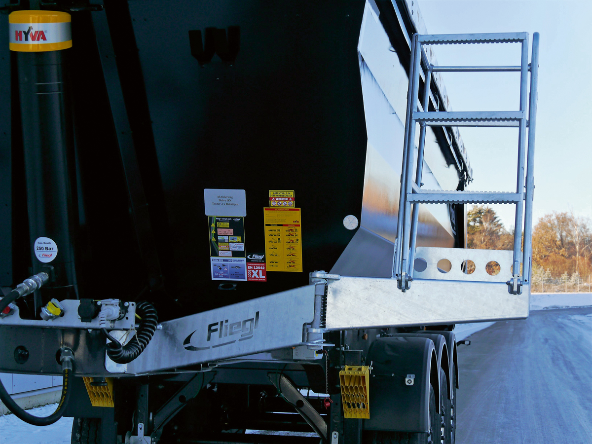 Alle Versorgungsanschlüsse sowie Schaufel und Besen befinden sich vorn am Fahrzeug. Nach dem Absatteln sorgen serienmäßige Kreuzverstrebungen an der 24-t-Zweigang-Stützwinde für Standsicherheit. Bis zum nächsten Einsatz parkt der Hydraulikschlauch in seiner Halterung und liegt nicht auf dem Boden – so bleibt die Kupplung sauber. Beim seitlichen Beladen mit dem Radlader geht immer mal Schüttgut daneben, dank der integrierten und steinabweisenden Kotflügel fällt es sofort auf den Boden und wird nicht auf die Straße transportiert.
