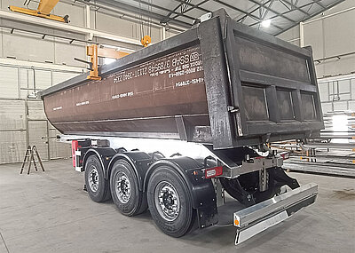Der Baustoffhandel Dresden Mitte ergänzte kürzlich seinen Fuhrpark um zwei dieser Kippauflieger. Fuhrparkleiter Heiko Höntsch berichtet: »Wir fahren ausschließlich Schüttgüter wie Sand, Kies und Erde. Da war uns eine robuste Stahlmulde wichtig, das Fahrzeug sollte aber natürlich trotzdem leicht sein.« Die Seitenteile der nutzlastoptimierten 24,5-m3-Rundmulde bestehen aus 4 mm dickem verschleißfestem Stahl; der Boden ist im vorderen Bereich 4 mm stark, in der höher belasteten Abschüttzone sind es 5 mm.