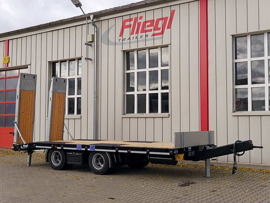Als erster Nutzfahrzeugbauer brachte Fliegl 1992 einen Tiefladeanhänger mit gerader Ladefläche auf den Markt (P-Modell). Die gerade Plattform und die niedrige Bauart garantieren Vielseitigkeit und optimale Gewichtsverteilung – für den Transport von Baumaschinen, Containern, Baustoffen oder auch Langmaterial. Stellvertretend für die heutigen Vertreter des Konzepts steht der DTS 300P mit rund 23,1 t technischer Nutzlast. In seinen Drehschemelvorbau ist ein abschließbarer Staukasten eingelassen. Sechs Zurrpunkte im vorderen Tiefbettbereich und sechs Zurrpilzpaare im Außenrahmen übernehmen die Ladungssicherung. §