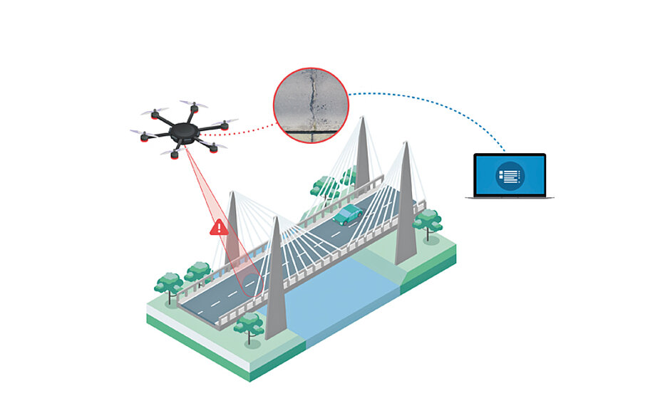 Zum Auftakt flog eine Drohne des Herstellers DJI die Route an der Brücke automatisiert ab. Um auch die Unterseite der Brücke erfassen zu können, wurde die Drohne mit einer oben montierten Kamera ausgestattet. Bei der Befliegung wurden die Bilder in die Plattform übertragen. Über eine Schnittstelle konnten die Aufnahmen der Drohne per KI-Analyse von Viscan Solutions ausgewertet werden. Diese KI kann Schäden auf Oberflächen wie Risse, Rost, Verschmutzungen, Abplatzungen und Bewuchs erkennen. Automatisiert führte die KI eine Schadbildanalyse durch und stellte Beschädigungen grafisch dar. Dadurch ließ sich die manuelle Nachkontrolle der Ingenieure auf ein Minimum reduzieren.