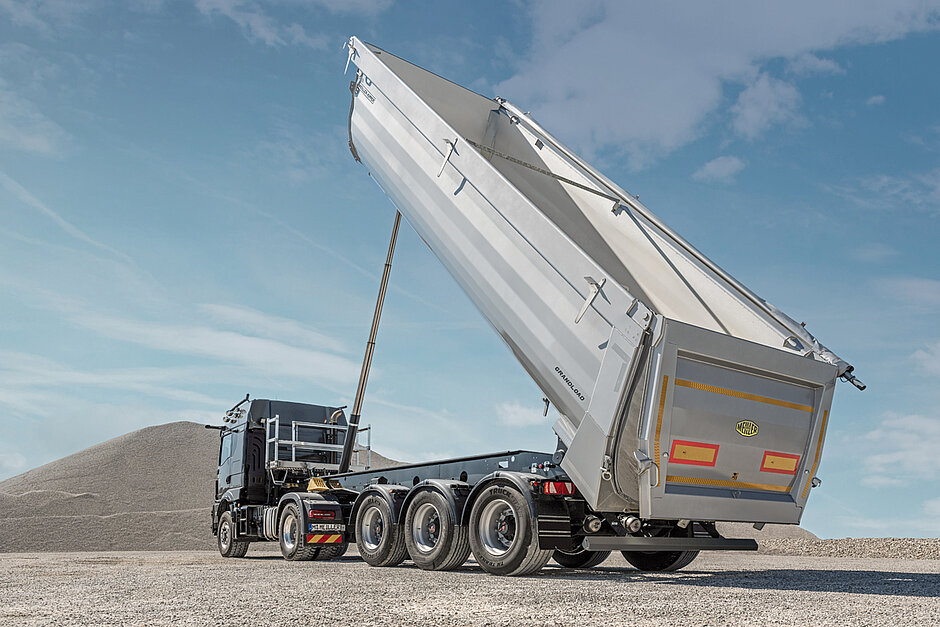 Kippsattelanhänger der Serie »Grandload« stehen für vielseitige Einsatzmöglichkeiten und hohen Fahrkomfort, selbst auf längeren Transportstrecken. Die Aufbauten beschreibt Meiller als »flexible Allrounder«, die eine hohe Anpassungsfähigkeit an die spezifischen Anforderungen der Kunden bieten.