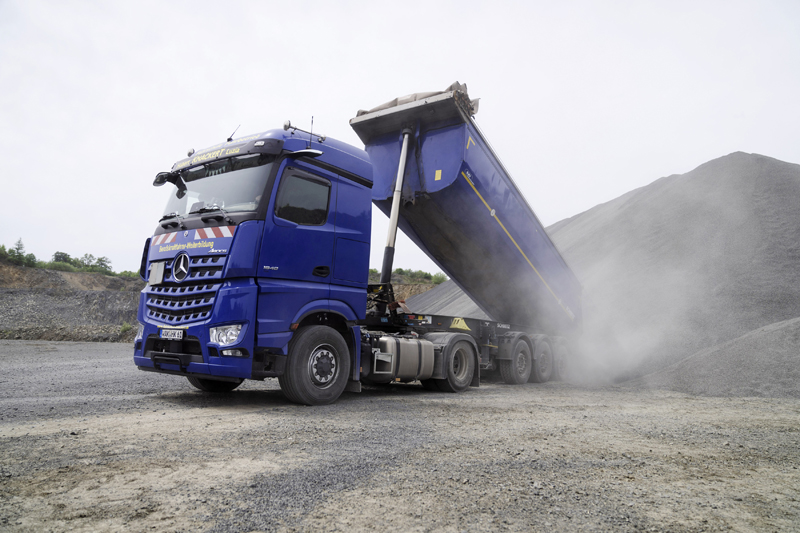 Vacha/Thüringen – Eine derart extreme Steigung würde Doreen Trabert mit einem rein heckgetriebenen Kippsattelzug nicht schaffen. Sie müsste einen Umweg fahren und sich dann womöglich in die Schlange der wartenden Lkw am Tor einreihen. Doch ihr Arocs 1848 hat Hydraulic Auxiliary Drive (HAD) an Bord, einen hydrostatischen Zusatzantrieb für die Vorderachse. So kann der schwere Bau-Lkw die steile Abkürzung auf dem Gelände des Steinbruchs problemlos bewältigen: Das Getriebe des Reihensechszylindermotors schaltet herunter. Die HAD-Radnabenmotoren bringen zusätzliche Traktion auf die Vorderachse. Und schon nimmt der Sattelzug den heftigen Anstieg – der Weg ist frei zur Halde, wo Doreen Trabert Edelsplit abladen muss.