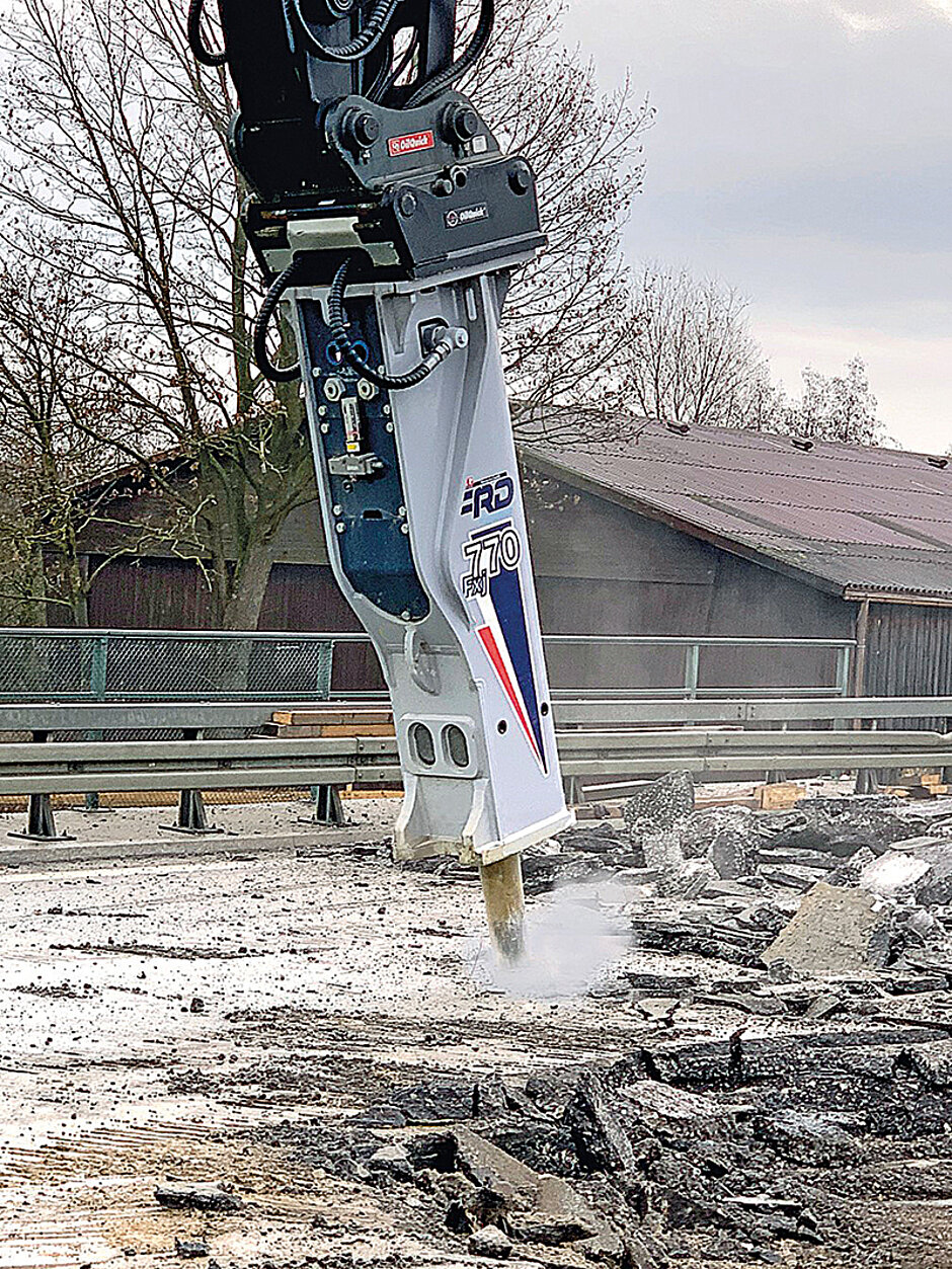 Bei derartigen Baumaßnahmen steht die Verfügbarkeit der Träger- und Anbaugeräte an vorderster Stelle. FRD zeigt sich für die Herausforderung gut gerüstet. Als FRD-Premium-Partner steht Z&P Baumaschinenservice aus Geisenfeld/Ilmendorf mit Serviceleistungen binnen kürzester Zeit zur Verfügung. Das Abbruchunternehmen Aktiv-Service aus Wolfratshausen hat sich bewusst für die Anbaugeräte von FRD entschieden. Geschäftsführer Gerhard Hermann hat in seinem Unternehmen viel Erfahrung mit den Anbaugeräten: »In der gesamten Zeit, seit ich die Zangen und Hydraulikhämmer von FRD einsetze, hat mich noch kein Gerät im Stich gelassen«, betont Hermann. t