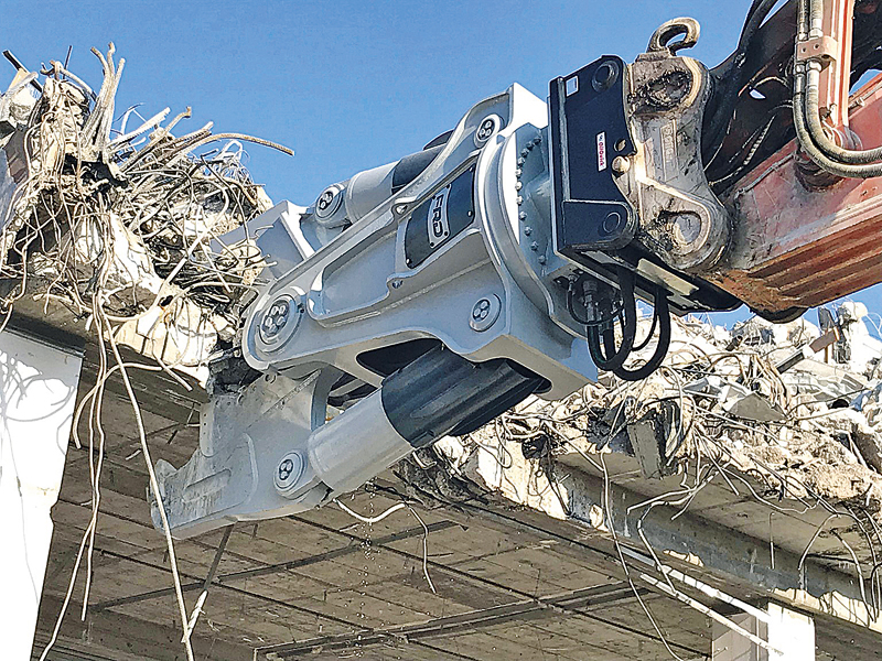 Brückenkonstruktionen benötigen für Sanierung und Abbruch eine aufwendige Herangehensweise. Die meist aus Stahlbeton errichteten Bauwerke müssen selektiv zurückgebaut und in ihre Bestandteile zerlegt werden. Hierfür kommt eine FRD-Abbruchzange V50M zum Einsatz. Das Modell mit einem Einsatzgewicht von 6 t und einer Brechkraft von 1 700 kN sichert Baggerfahrern den selektiven Rückbau auch massiver Stahlbetonkonstruktionen. Das zurückgebaute Material ist so direkt beim ersten Arbeitsschritt für eine nachhaltige Weiterverarbeitung vorbereitet.