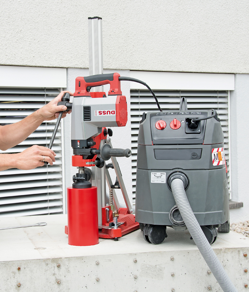 Die Duss-Diamantbohrkronen CSL für Trockenbohrungen mit Softschlag sind auf die Maschine und das Absaugsystem abgestimmt. Dank ihrer Schnittfreudigkeit, dem ruhigen Bohrverhalten und einem hohen Absaugvolumen sollen hand- oder ständergeführte Bohrungen in Beton oder armierten Beton problemlos möglich werden. Effizientes Trockenbohren ist nur mit einer hochfunktionalen Staubabsaugung möglich. Großdimensionierte Absaugöffnungen an Diamantbohrkronen CSL unterstützen im Zusammenspiel mit Maschine und Industriesauger den Bohrmehlabtransport. Eine saubere Arbeitsumgebung und der Entfall aufwendiger Reinigungsarbeiten nennt Duss als positive Nebeneffekte.