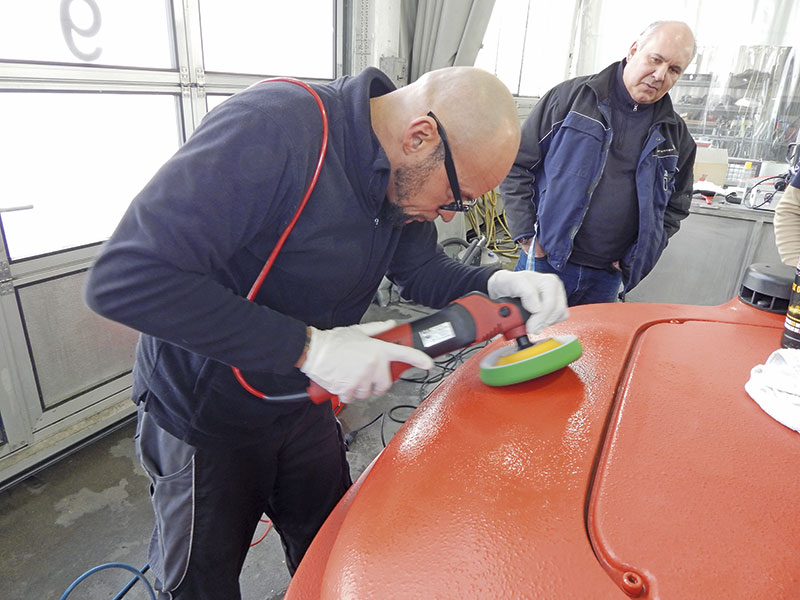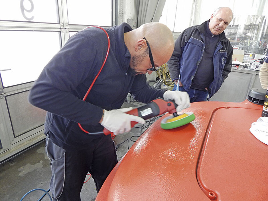Als letzter Schritt stand mit der Lackaufbereitung die Königsdisziplin auf dem Plan. Der Strukturlack ist blass und matt und stellt durch seine Struktur selbst Profis wie Michael Marx vor eine Herausforderung: »Einerseits brauchen wir eine stark schleifende Wirkung, andererseits muss man darauf achten, die Erhöhungen in der Lackstruktur nicht blank zu schleifen.« Also griff der Aufbereiter zu Poliermaschine und Polituren aus der Sonax-Profiline-Serie.