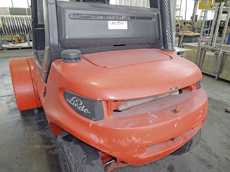 Die Firma Brunner in Stockstadt bei Aschaffenburg ist Spezialist für Oberflächenbeschichtungen, im Vordergrund steht die Chassislackierung von Linde-Gabelstaplern. Um diese vom Transporter in die Lackierhalle und wieder zurück zu bewegen, kommt ebenfalls ein Linde-Stapler zum Einsatz. Seit Jahren leistet er gute Dienste, doch mittlerweile ist er im wahrsten Sinne des Wortes »angegraut«. Hohe Staub- und UV-Belastung haben dem Lack und dem Innenraum stark zugesetzt. Der Aufbereitungsprofi Michael Marx und Sonax-Gebietsleiter Thorsten Schwetschenau traten an, um dem Stapler zu neuem Glanz verhelfen.