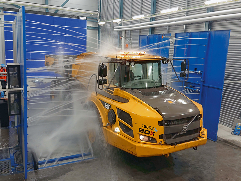 Das suchte nach einer Lösung, um die unterschiedlichen Maschinen, vom kleinen Minibagger bis zum 4,5 m breiten Muldenkipper, möglichst effizient und kostensparend zu reinigen. Überzeugt hat am Ende die MobyDick genannte Demucking-Technologie von Frutiger mit »viel Wasser und wenig Druck«.