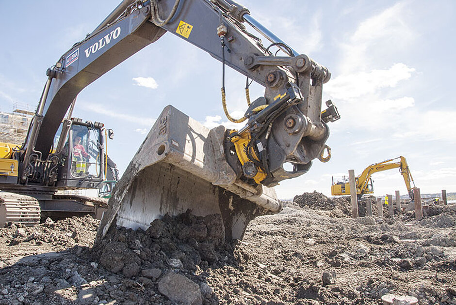 Mit der Generation 2, mit deren Neuentwicklung bereits vor gut fünf Jahren begonnen wurde, sehen Stig Engström, Sten Strömgren und Jürgen Bergmann die Engcon Group im Wettbewerb »sehr weit vorne positioniert«. Vor allem auch deshalb, weil in der neuen Produktreihe – die derzeit mit fünf Modellen den Einsatzbereich von 3,6 t bis 26 t abdeckt – die Brechkraft sowie das Drehmoment höher ist und viele Features »schon standardmäßig verbaut sind«, so Sten Strömgren. Dazu zählen beispielsweise die integrierte Zentralschmierung und die Sechs-Kanal-Drehdurchführung, die Hydraulikflüsse von bis zu 120 l/min zulässt, oder die optionale Ausrüstung mit einem Greifer bei allen Modellen. Künftig wird es sogar möglich sein, so Sten Strömgren, die Engcon-Tiltrotatoren nachträglich mit einem Greifer zu bestücken. Als weitere Neuheit kündigte er die Markteinführung des »kleinsten Engcon-Tilts« – dem EC204 für Bagger in der Gewichtsklasse von 1,5 t bis 3,5 t – für diesen Sommer an.»Sicherster Schnellwechsler«