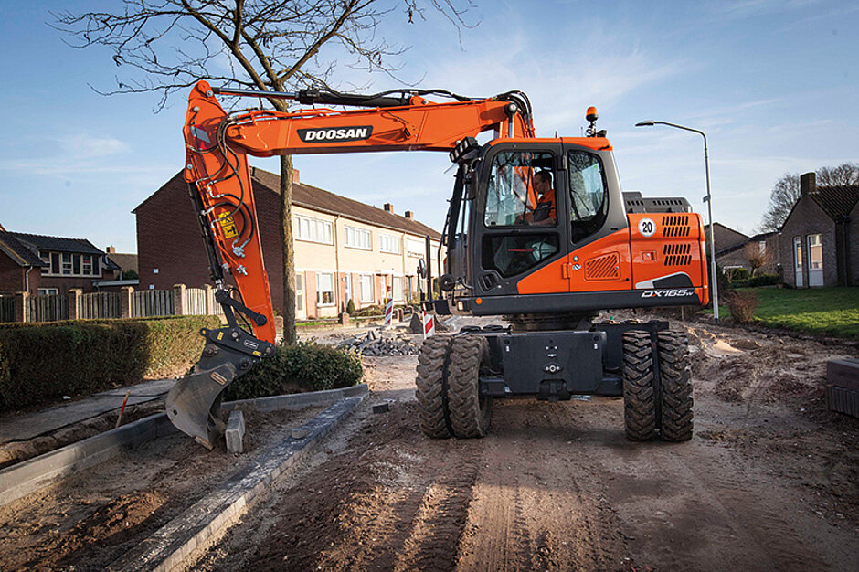 Charakteristisch für den neuen mobilen Doosan-Kurzheckbagger DX165W-5 ist ein mit 1 850 mm besonders kurzer Heckschwenkradius. Er verfügt über den selben Unterwagen wie das Modell DX160W-3, der dank seines langen Radstands einen optimalen Schwerpunkt und eine ideale Gewichtsverteilung unterstützt. Der DX165W-5 bietet darüber hinaus eine neue Generation von ZF-Hochleistungsachsen für bestmögliche dynamische und statische Achslast. Bei der Leistung verfügt der DX165W-5 in Abhängigkeit des Einsatzes über die gleichen Kräfte und Hubkapazitäten wie das Stufe-IIIB-konforme Modell DX160W-3. Der DX165W-5 kann hohe 5,87 t bei einer Reichweite über die Front (bei 3 m Höhe) und 4,28 t über die Seite anheben. Mit seinem geringen Heckschwenkradius und einem kleinen Wendekreis beträgt der minimale Schwingdurchmesser des DX165W-5 bei vollständig eingefahrenem Ausleger lediglich 4,5m.