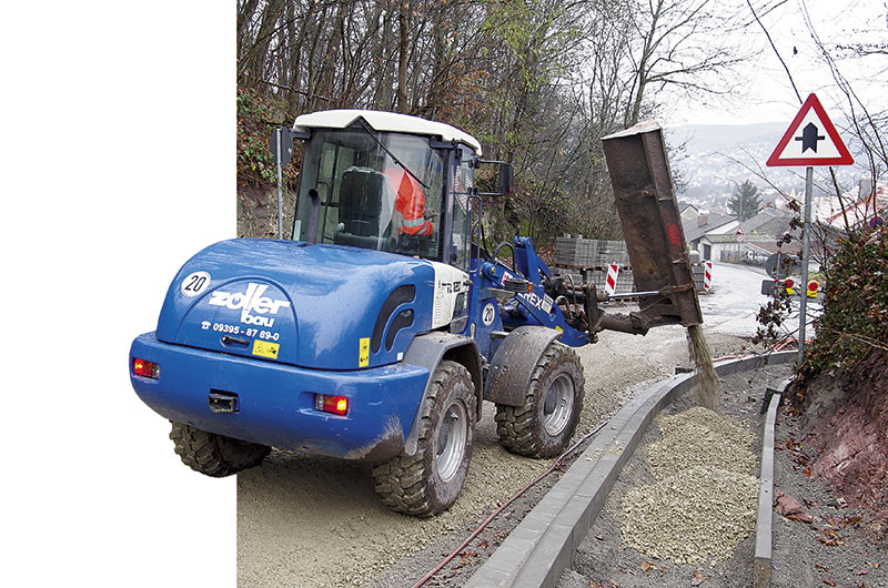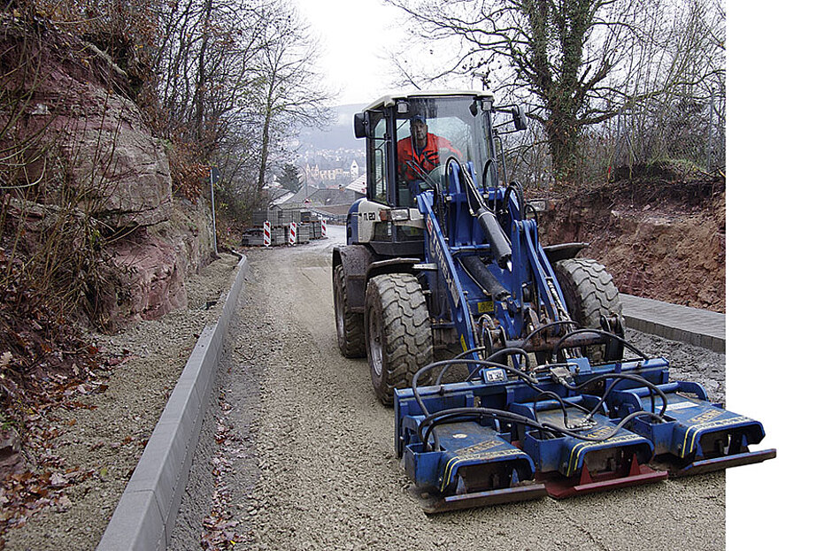 Für die Fahrbahn und den als Entwässerungsrinne gepflasterten Gehweg wird ein stabiler, gut verdichteter Unterbau benötigt. »Um das Planum für die Tragschicht herzustellen, verwenden wir einen seit Jahren bewährten Plattenverdichter SBV55 H3 von Stehr, den wir auch an unserem neuen Terex-Radlader anbauen können. Auch deshalb haben wir uns für den TL120 entschieden«, betont Hofmann. Wie wertvoll die für Terex typische Trennung des hydrostatischen Fahrantriebs im geschlossenen Kreis von der Laderhydraulik ist, zeigt sich beispielhaft beim Betrieb des effizienten Anbaugeräts mit drei Rüttelplatten. Der Kompakt-Radlader liefert über die elektroproportional geregelte 230-bar-Arbeitshydraulik und seinen serienmäßigen dritten Steuerkreis die Kraft für das Anbaugerät. »So verdichten wir präzise, während die Maschine den schweren Plattenverdichter mit wohldosierter Leistung über das Planum schiebt«, erklärt Fahrer Olaf Schumacher, Polier bei Zöller-Bau.