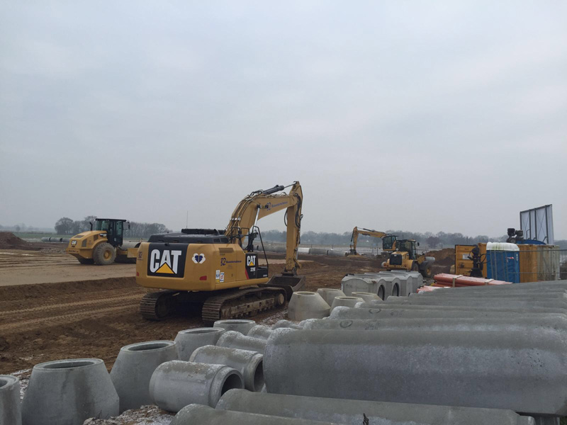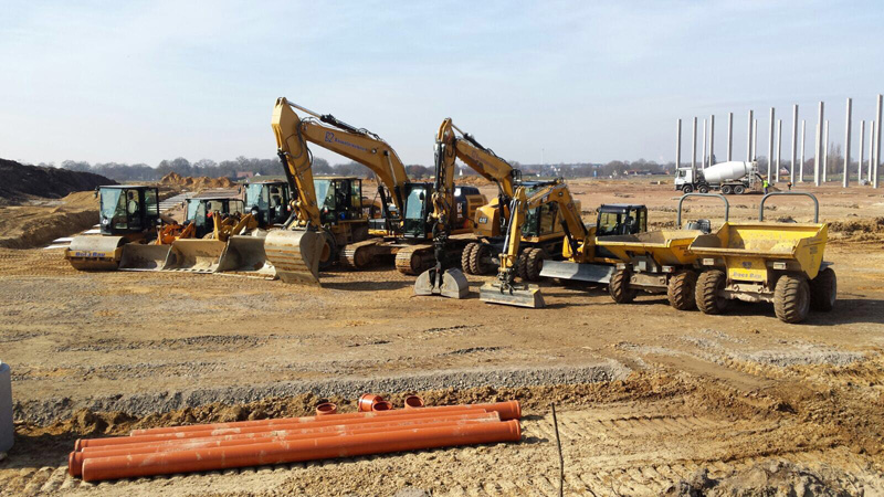 Baumaschinen, wie das neue Radlader- Trio, aber auch Mobil- und Kettenbagger müssen die anfallenden Arbeiten stemmen. Der innerstädtische Kanalbau mit der Erschließung von Gas, Wasser, Strom und Glasfaser ist einer der Grundpfeiler des Firmenverbunds, der überregional agiert. Alles, was mit Tiefbau zu tun hat, gehört zum Aufgabenspektrum. Vier von rund 20 Kolonnen übernehmen den Neubau, den Unterhalt sowie die Instandhaltung. Für die Samtgemeinde am Firmensitz in Zeven leistet man auch den Notfalldienst für Versorgungsleitungen. Ein weiteres Standbein ist der Erdbau. In Oyten wirkte Boes Bau 2016 mit, eine neue Logistikhalle in Form eines Zubringers für VW im Auftrag von Goldbeck zu realisieren. Dafür mussten 40 000 Kubikmeter Boden bewegt und eine Fläche von 40 000 Quadratmetern bearbeitet werden. Hinzu kamen Aufwendungen von Bodenstabilisierung, um einen tragfähigen Untergrund zu schaffen. Dazu musste der Boden gelöst, gefräst, abgetragen und vermörtelt werden, wobei die ganze Bandbreite an Cat Maschinen dabei zu Gange war. „Wir führen einen Großteil der Aufträge für Logistiker aus und machen etwa die Vorbereitungen für Fundamente, wenn neue Lagerhallen errichtet werden und erstellen dann im Anschluss noch die gesamten Außenanlagen“, erklärt Geert Boes.