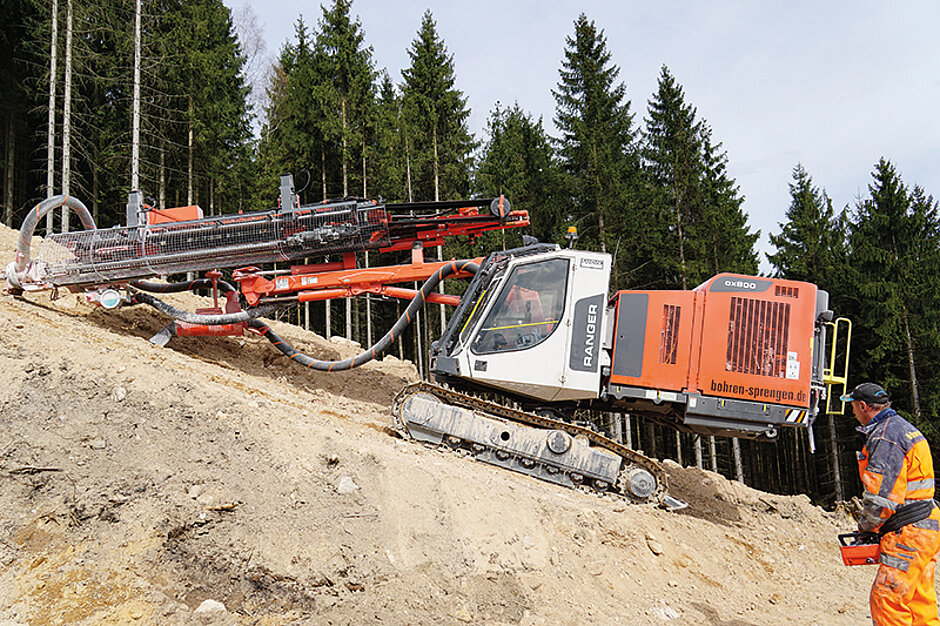 »Wir wollen uns verstärkt auf unsere Region konzentrieren, um hohe Transportkosten zu vermeiden und umweltfreundlicher zu agieren«, erläutert Jens Weiß die Ausrichtung des Unternehmens. So entschied man sich im Hause zur Erweiterung des Leistungsspektrums und in die Investition in das neue funkferngesteuerte Ranger Modell DX800. »Der drehbare Oberwagen war einer der herausragenden Funktionen und Entscheidungskriterium für dieses Sandvik-Modell«, so Weiß. »Auf Baustellen deckt das Übertagebohrgerät von einem Standort eine enorm große Fläche ab – über 26 m², ohne das Gerät zu verfahren. Weitere Highlights sind die umweltfreundliche Motortechnik, der geringe Kraftstoffverbrauch pro Bohrmeter, sowie der neue Hochfrequenzhammer«, ergänzt er begeistert.