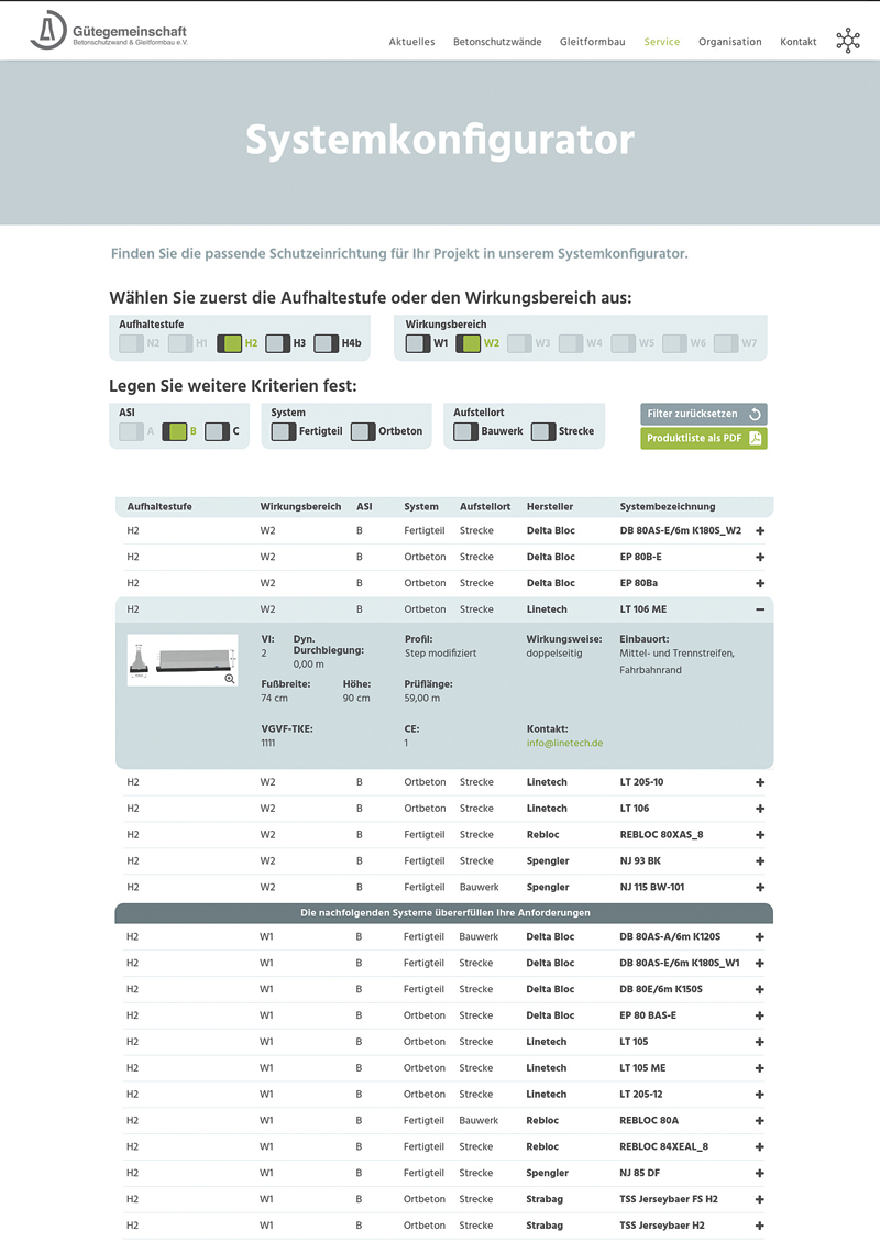 Highlight der Webseite ist der Systemkonfigurator, zu finden unter der Rubrik »Service« oder direkt unter besser-beton.de/service/systemkonfigurator. Damit können die aktuell verfügbaren Betonschutzwände über zwei Klicks schnell in beliebigen Kombinationen von Aufhaltestufe und Wirkungsbereich selektiert werden. Darüber hinaus ist eine Auswahl nach ASI, der Bauart (Fertigteil oder Ortbeton) und dem Aufstellort (Strecke oder Bauwerk) möglich. Da alle Hersteller von in Deutschland lizenzierten Betonschutzwandsystemen in der Gütegemeinschaft organisiert sind, bietet die Liste zugleich einen vollständigen Überblick über den deutschen Markt.