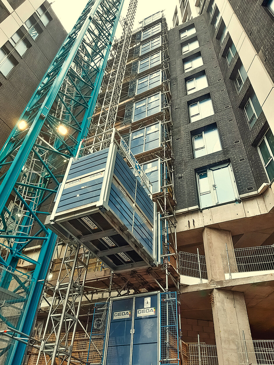 Um einen zügigen Baufortschritt zu gewährleisten, hat sich das Bauunternehmen Colmore Tang Construction für den Einsatz von zwei Personen- und Materialaufzügen entschieden. Die Aufzüge vom Typ GEDA Multilift P22 wurden über Hoist Hire Service angemietet.