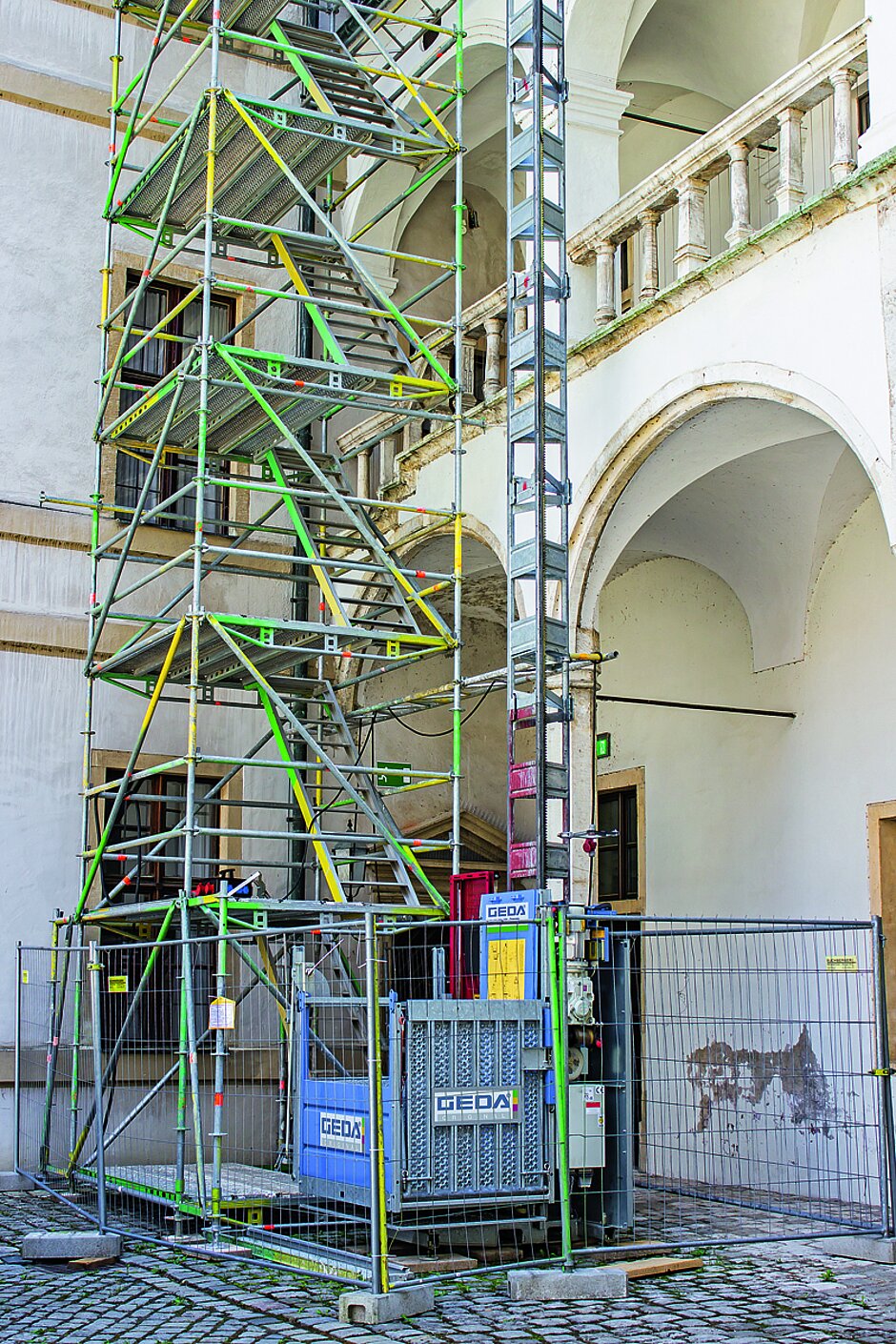 Dank zwei separater Steuerungen ist die Transportbühne wahlweise als reiner Bauaufzug zum Materialtransport oder als Transportbühne für Material und maximal drei Personen einsetzbar. Mit einer Hubgeschwindigkeit von 12 m/min befördert der GEDA 300 Z/ZP bis zu 500 kg bzw. drei Personen in 50 m Höhe. Am Glockenturm auf Schloss Neuburg beträgt die Förderhöhe bis zur Laterne ca. 30 m. Auch in puncto Sicherheit bietet GEDA ein Komplettpaket, der 300 Z/ZP ist mit üblichen Sicherheitseinrichtungen wie Endschaltern, geschwindigkeitsabhängiger Fangvorrichtung, Sicherheitsstopp und Überlastabschaltung ausgestattet. Die »Schmiereinrichtung« ist serienmäßig mit enthalten und sorgt für deutlich geringeren Verschleiß der Zahnstangen und Ritzel.