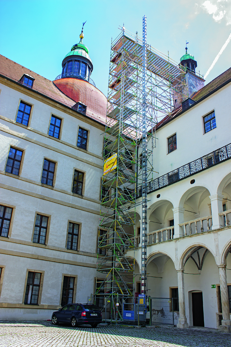 Um den Umfang der Sanierungsmaßnahme abzuschätzen, galt es, einen Zugang zur Laterne entlang der Gerüstkonstruktion zu ermöglichen. Hierfür hat die Firma Höchtl Baugeräte eine Transportbühne vom Typ GEDA 300 Z/ZP an das Neuburger Gerüstbauunternehmen BVA Bergmüller vermietet.