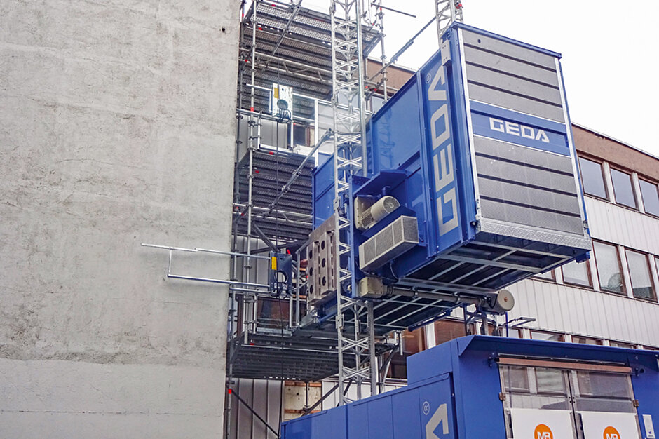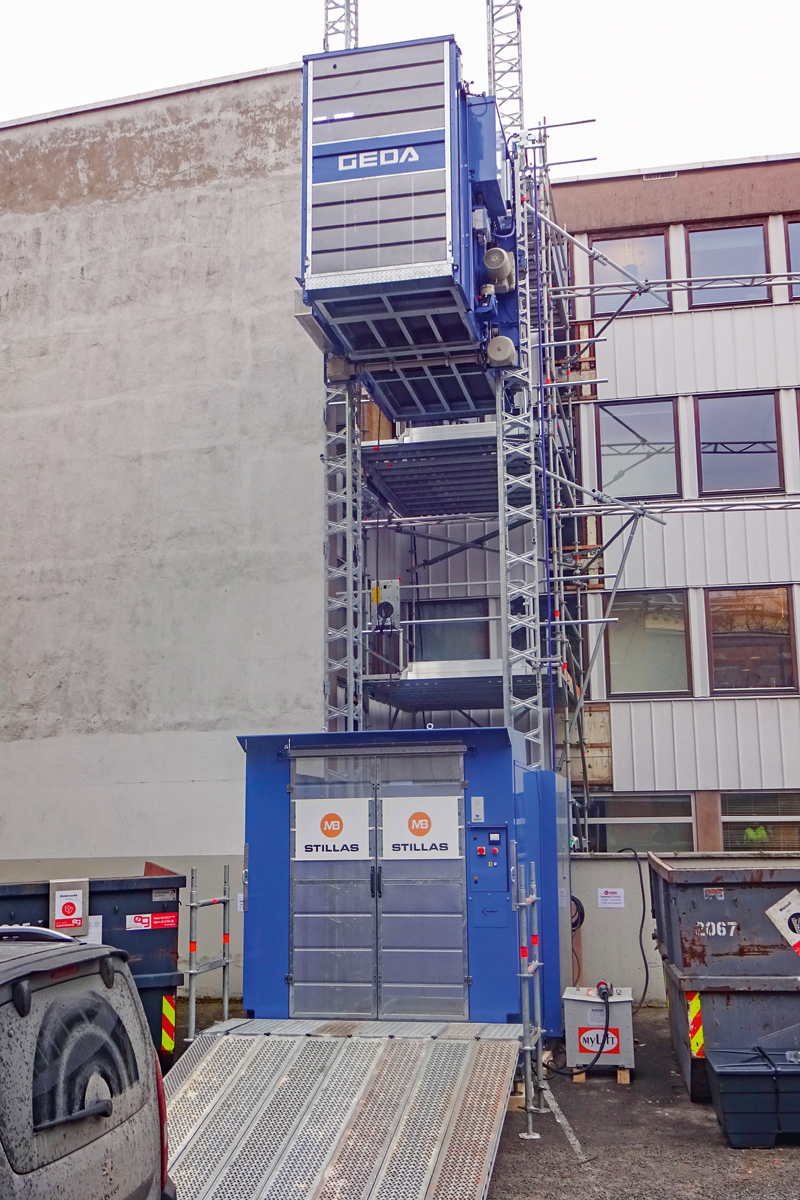Derzeit laufen die Renovierungsarbeiten der insgesamt 500 m² Büroflächen. Dabei setzt das beauftragte Bauunternehmen für den Transport sämtlicher (Bau-)Materialien sowie für die Beförderung von Möbelstücken den GEDA Multilift P18 ein. Trotz der vergleichsweise geringen Gebäudehöhe von nur fünf Stockwerken sei es für den Kunden wichtig, einen großen Aufzug mit hoher Kapazität im Einsatz zu haben, so Kristian Borud, CEO von MB Stillas. Das Unternehmen mit Sitz im norwegischen Ingeberg und weiteren Niederlassungen in Lillehammer und Skedsmo hat sich auf den Gerüstbau spezialisiert.
