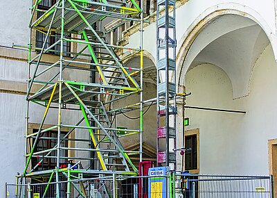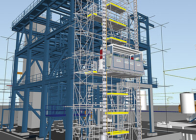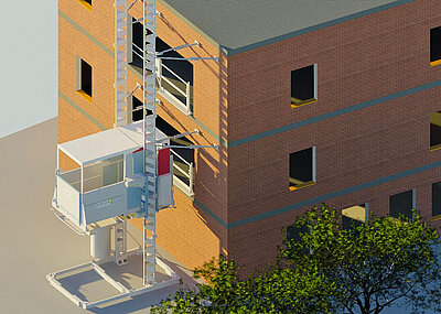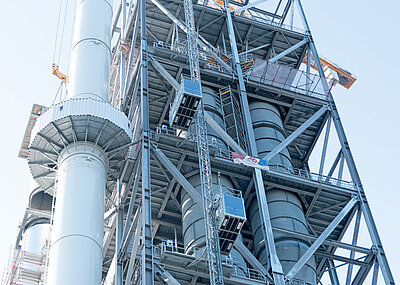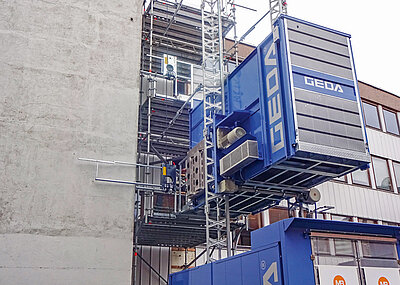 Bei diesem Bauwerk muss die Transportbühne 17 Stockwerke bedienen und eine Förderhöhe von 85 m bewerkstelligen. Mit einer maximalen Förderhöhe von 130 m deckt der GEDA 1200 Z/ZP diese Vorgaben ab. Das große Ladevolumen von 1 500 kg erlaubt, viele Baumaterialien zügig und sicher an ihren Einsatzort zu transportieren. Das spart nicht nur Zeit, sondern auch Geld bei jedem Bau.