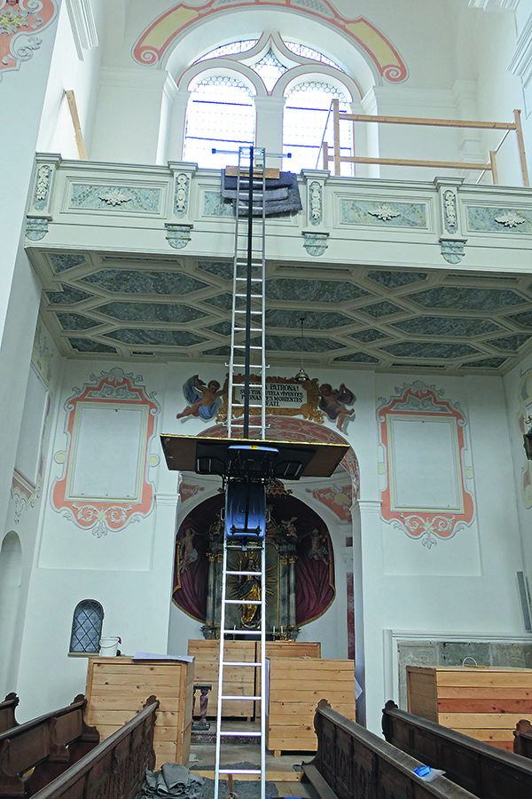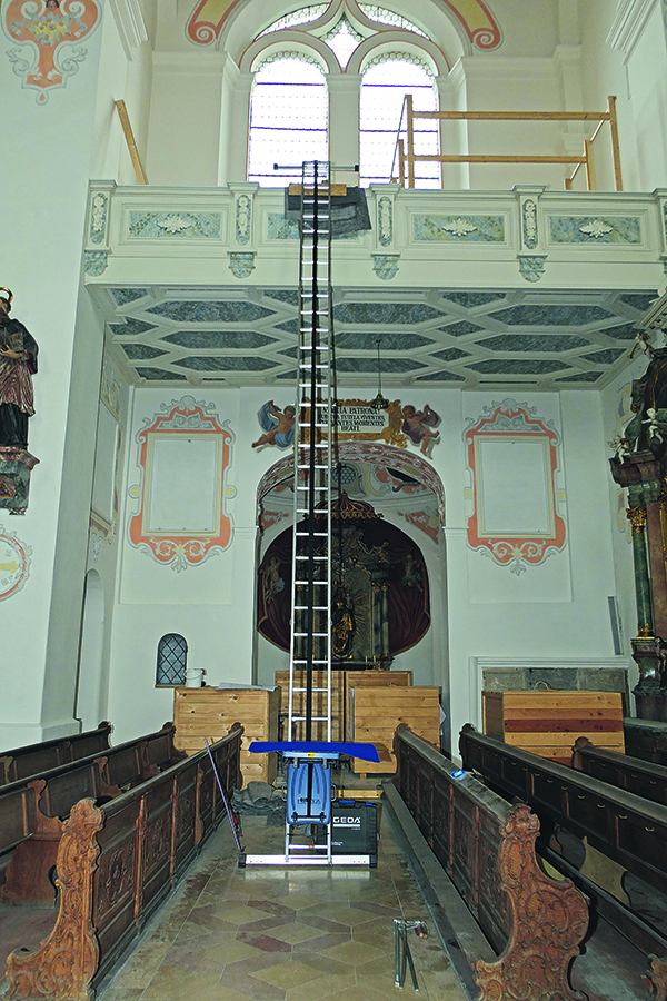 Nach der Behebung der statischen Probleme ging es im zweiten Bauabschnitt an die Innenrenovierung der Basilika. 2,5 Mio. Euro sind hierfür veranschlagt. Stuck und Wandmalereien sollen erhalten bleiben und ihre alte Leuchtkraft zurückbekommen, ebenso stand die Restaurierung wertvoller und teilweise jahrhundertealter Bilder oder Statuen an. Um Schäden an den Kunstwerken während der laufenden Sanierungsarbeiten zu verhindern, wurden sämtliche Gegenstände sicher verpackt und auf der Empore der Basilika zwischengelagert. Zur Beförderung der empfindlichen Fracht griffen die Experten der Firma Schwertberger auf eine clevere Transportlösung zurück: Zum Einsatz kam ein akkubetriebener Materialaufzug aus Asbach-Bäumenheim.