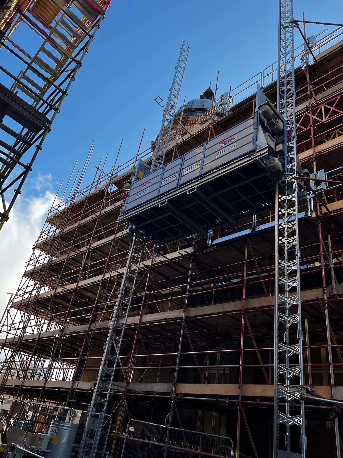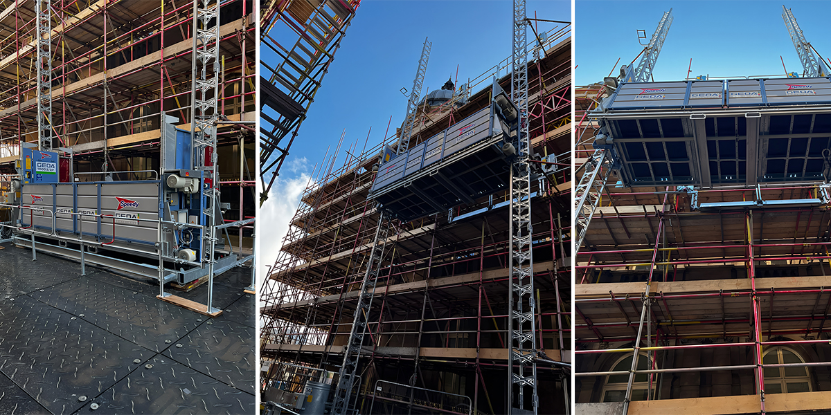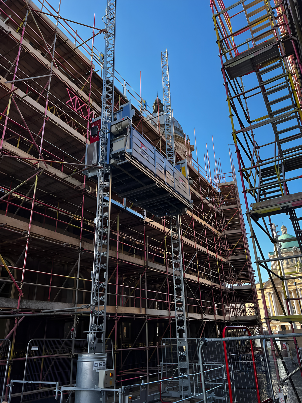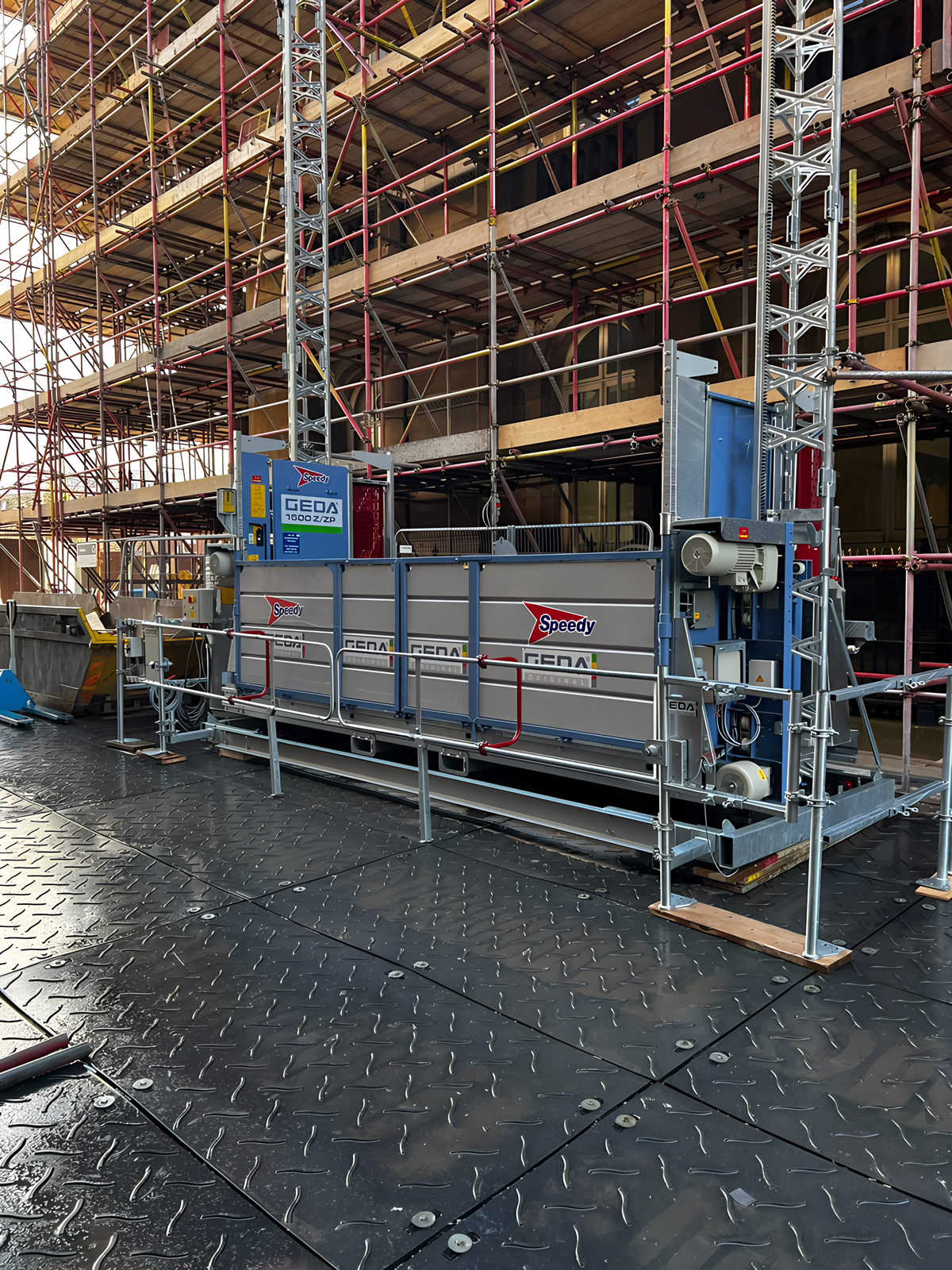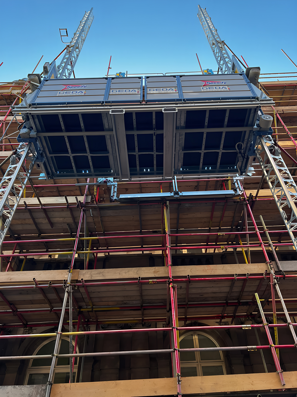 Bereits zu Beginn wurde an der Außenfassade des Gebäudes ein Rohrgerüst errichtet, das nicht nur den Arbeitern verschiedener Gewerke den Zugang zu ihren Arbeitsplätzen ermöglichen, sondern auch Arbeiten direkt an der Fassade erlauben soll. Um die Logistik hier effizienter zu machen, entschied sich der Generalunternehmer für die langfristige Miete eines Bauaufzugs und fand in der 2-t-Transportbühne Geda 1500 Z/ZP von Speedy Hire die passende Lösung. Glen Philips, verantwortlicher Projektleiter bei Speedy, beschreibt die Herausforderungen die dieser Ansatz mit sich brachte: „Zunächst mussten wir uns mit dem Gerüstvermieter abstimmen, da wir einige Änderungen am Gerüst durchführen mussten. Nachdem wir die vergleichsweise geringen Verankerungskräfte des Bauaufzuges bestätigt hatten, konnten wir die Maschine direkt am Gerüst verankern. Dies war die deutlich bessere Alternative, da die historische Fassade des Gebäudes unter Denkmalschutz steht und daher nicht angebohrt werden durfte. Außerdem haben wir die üblichen 2-m-Felder des Gerüsts auf eine Breite von 3 m angepasst, um die breite Entladerampe des Aufzugs zu integrieren. So konnten die oft sperrigen und palettierten Materialien direkt von den Lkws in den Aufzug und von dort ins Gebäude transportiert werden."