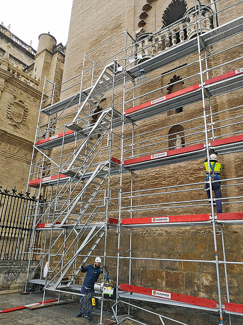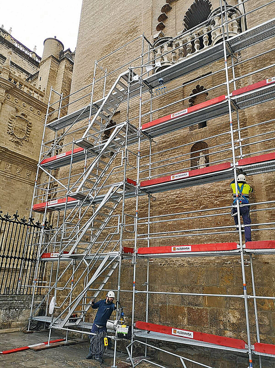 Der Zahn der Zeit nagt am geschichtsträchtigen Gemäuer und so werden derzeit umfassende Sanierungsarbeiten an Sevillas Wahrzeichen durchgeführt. Nach dem Abschluss der Arbeiten an der Süd- und Westfassade erstrecken sich die weiteren Maßnahmen nun an der Ostseite der Giralda vom Minarett bis hin zur Terrasse der Lilien. Neben Schutz- und Verfestigungsarbeiten am Gemäuer und der Restaurierung maurischer Fassadenmalereien unterziehen die Spezialisten die Fassade auch einer gründlichen Reinigung. Um einen zügigen Fortschritt der Sanierungsarbeiten zu gewährleisten, entschied sich das mit dem Gerüstaufbau beauftragte Unternehmen Alquiansa für den Einsatz eines GEDA-Seilaufzugs.