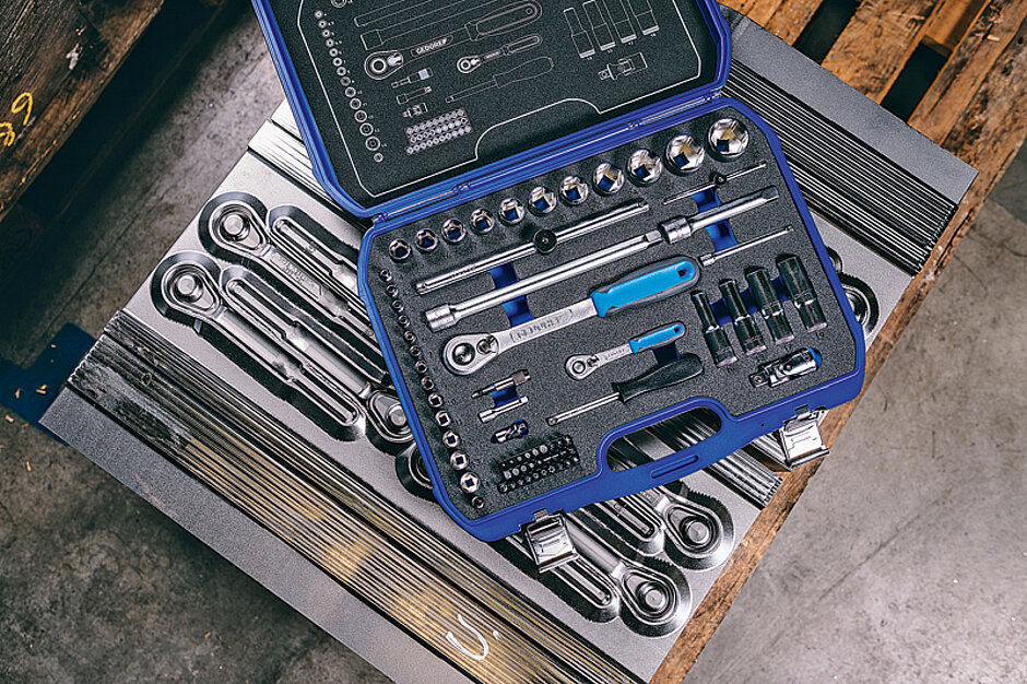 Die beiden Knarren 1993-U 20 und 2093-U 20 sind aus verchromtem Gedore-Vanadium-Stahl 31CrV3 gefertigt und verfügen über einen rutschfesten 2-Komponenten-Griff, der durch die ergonomische Form besonders gut in der Hand liegen soll. Der Knarrenkasten mit Steckschlüsselsatz ¼" und ½" ist Teil von »Gedore Essentials«, einer Auswahl an limitierten Werkzeugen und Produkten in Sonderauflage, die anlässlich des 100-jährigen Firmenjubiläums entwickelt wurden. t