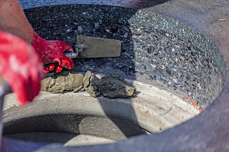 Durch das »rücksichtslose« Überfahren der Stahlplatte kann die Asphaltbaukolonne eine flächendeckende perfekte Ebenflächigkeit ohne Hindernis im Asphaltflächenbereich erzielen. Direkt nach dem Einbau der Asphaltlage und vor dem Walzen wird der Deckel des Zylinders im frischen Asphalt freigelegt und mit dem Haken von Hand auf die Höhe der ungewalzten Asphaltlage gezogen. Der Deckel bleibt immer sichtbar frei. Anschließend erfolgt die maschinelle Verdichtung mit den hochwertigen Asphaltwalzen auch im Bereich der Schachtbauwerke.
