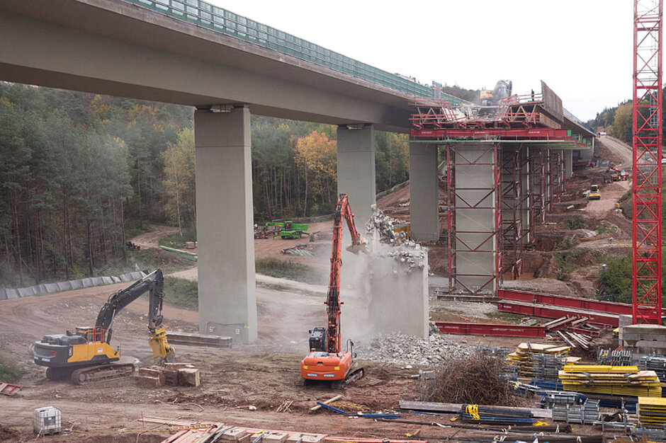 Sebastian Wess vom ausführenden Unternehmen Wende schildert die Herausforderungen bei diesem Projekt: »Wir müssen insgesamt rund 20 000 t Stahlbeton entfernen. Zudem ist der zerkleinerte und aufbereitete Beton bereits fest in unserer betrieblichen Stofflogistik eingeplant. Außerdem arbeiten wir unter Zeitdruck. Denn parallel zum Abbruchfortschritt wird bereits die neue Brücke gebaut.«