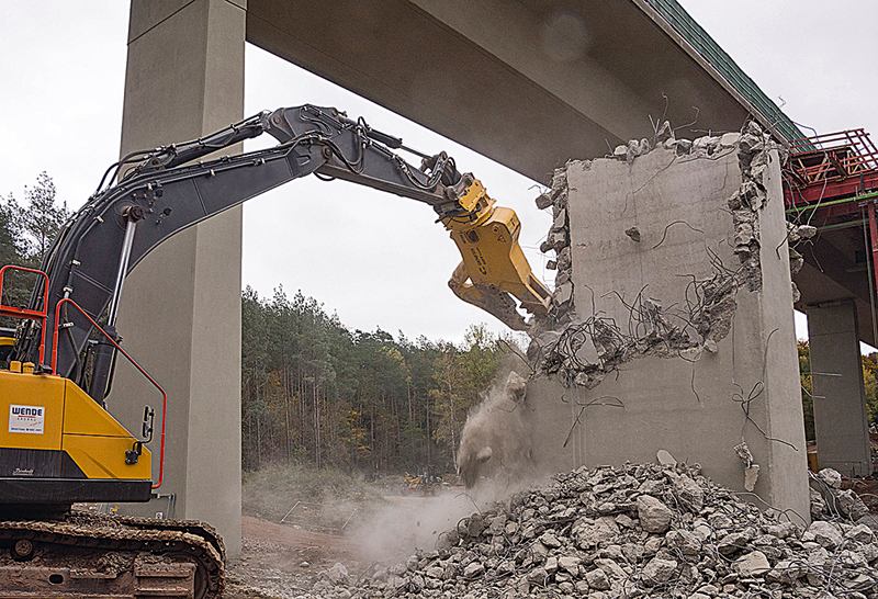Wende Erdbau ist ein seit 1947 bestehender Spezialist für den Erdbau, den Abbruch und das Baustoff-Recycling aus dem hessischen Fulda. Als ein Vorzeigeprojekt betreibt das 70-köpfige Unternehmen den Abbruch der Talbrücke Langenschwarz im Verlauf der A7. Das Bauwerk aus dem Jahr 1967 zeigte sich den heutigen Verkehrslasten nicht mehr gewachsen und soll bis 2021 durch einen Neubau ersetzt werden. Im ersten Abschnitt wird das westliche Bauwerk (Fahrtrichtung Kassel – Würzburg) komplett abgebrochen – Überbau und Pfeiler, Fundamente und Widerlager.
