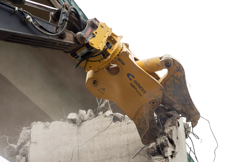 An ihrem höchsten Punkt ist die Brücke 35 m hoch, deswegen musste für den Abbruch des Überbaus eigens ein Traggerüst errichtet werden. Von dort aus zerkleinert ein 30-t-Bagger den Hohlkasten mit einer von Genesis gelieferten Abbruchschere GDT 290 und sortiert das Abbruchmaterial in die Fraktionen Stahl und Beton. Mit einer Schrottschere des Typs Genesis GXT 225 R wird der Bewehrungsstahl zerschnitten. Wenn ein Brückenfeld abgerissen ist, zerlegt ein 35 t schwerer Longfront-Bagger den freigelegten Brückenpfeiler. Für die letzten fünf Höhenmeter bis zum Fundament wechselt der Fahrer in einen 40-t-Bagger, der mit höherer Hydraulikleistung und kürzerem Ausleger rascher vorankommt.