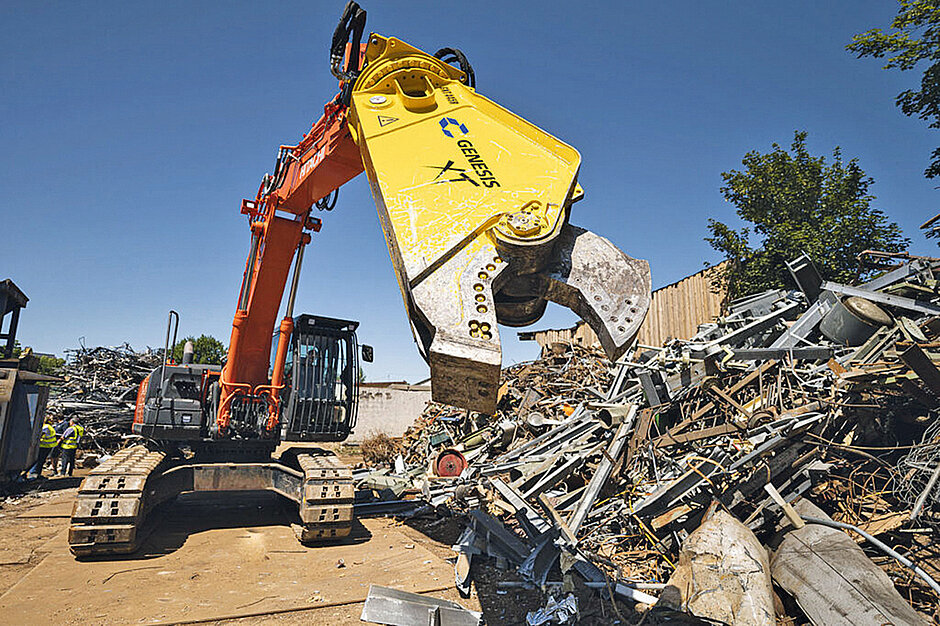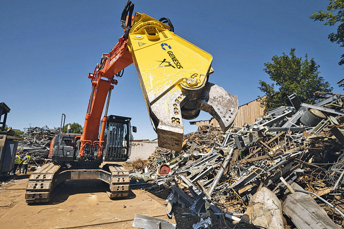 Edelstahl- und Stahlschrott, Gussteile und Buntmetalle – mit modernen Betriebsmitteln verarbeiten die Spezialisten von Eisen Braun diese Sekundärrohstoffe. Neben drei neuen Umschlagmaschinen gehört seit vergangenem Juni eine Schrottschere des Typs Genesis XT 445R an einem 29-t-Bagger zum technischen Inventar. Die Schere wurde mit einem Öl-Rücklauffilter ausgerüstet, um die Hydraulikanlage vor eventuellen Verschmutzungen zu schützen. Nach dem Vorsortieren von angeliefertem Material werden per Bagger und Schrottschere in einer ersten Station der Schwerschrott der Sorte E3 für die Weiterverarbeitung vorzerkleinert oder große Stahlelemente für den Bahntransport zum Elektrostahlwerk auf Länge gebracht. In einer weiteren Station werden schwere Stahlträger für den Versand zum Gusswerk ebenfalls mit der Genesis XT zerkleinert. Die Schrottschere ist somit ein ideales Anbaugerät für die Vorbereitung aller weiteren Verarbeitungsschritte in der Stahl-Recyclingwirtschaft.