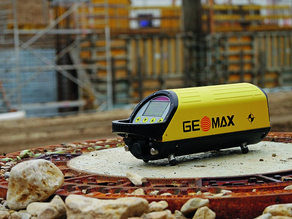 Der Geomax-Kanalbaulaser will mit einer auf dem Markt einzigartigen Funktion aufwarten: Der Richtstrahl um den Kanal in Richtung und Steigung/Neigung zu justieren ist mit einem vertikal rotierenden Strahl gekoppelt. Dieser vertikal rotierende Strahl ist mit jedem normalen Handempfänger darzustellen, ein Umstand, den man sich beim Einrichten der Strecken zwischen den Schächten zu Nutze macht. Sonst bekannte Schnurkonstruktionen an den Fluchtstäben entfallen. Das Abloten – immer wieder eine Fehlerquelle – muss nicht mehr mit der Schnur durchgeführt werden. Die Vorgehensweise ist dabei einfach: Ein Handempfänger wird an der Oberflächenkante auf der Achse zwischen den Schächten positioniert. Mithilfe der Fernbedienung wird der rotierende Strahl in die Achse verfahren. Der Richtstrahl ist exakt in der gewünschten Position.